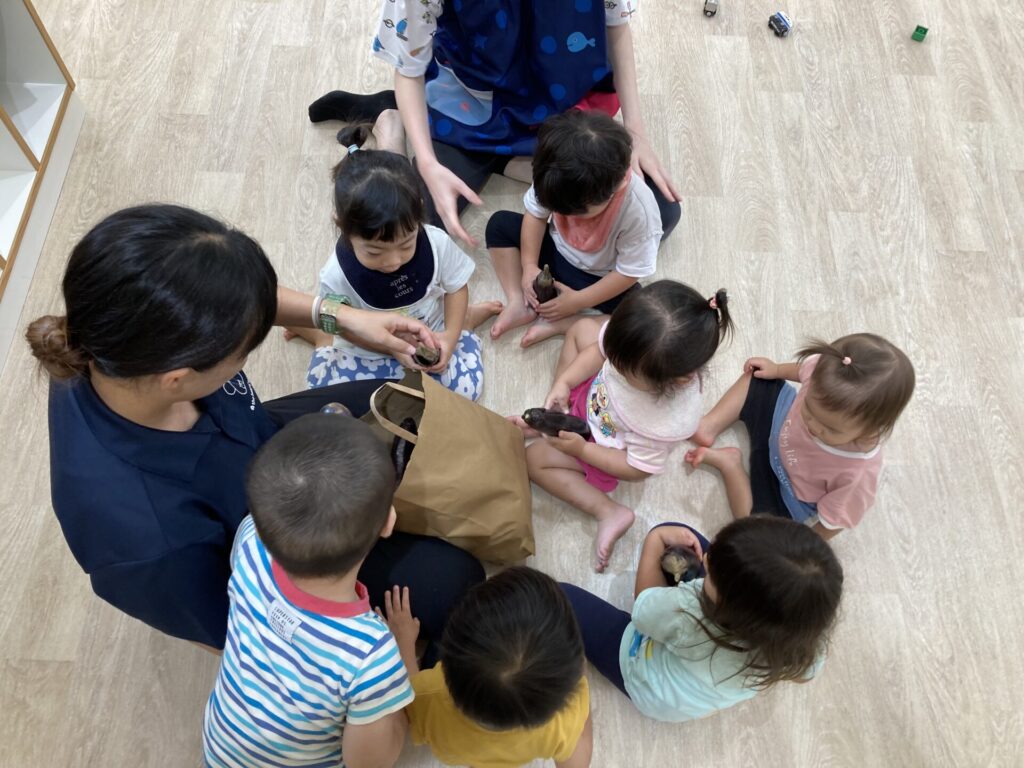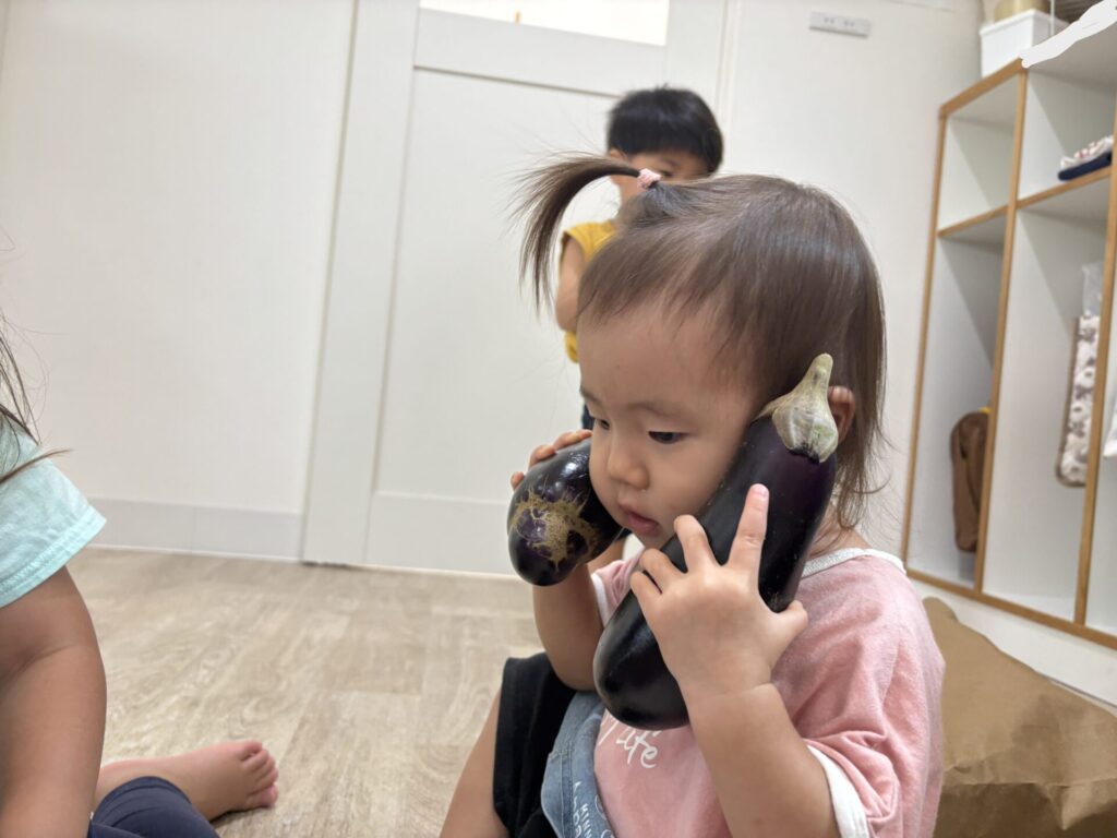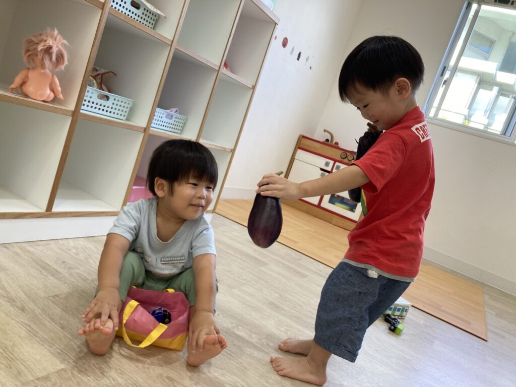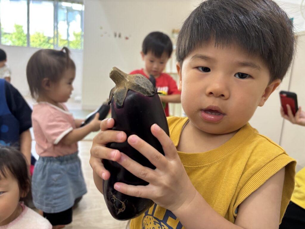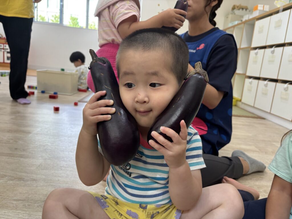 あちらこちらで子どもたちが茄子を頬に当てていました😊