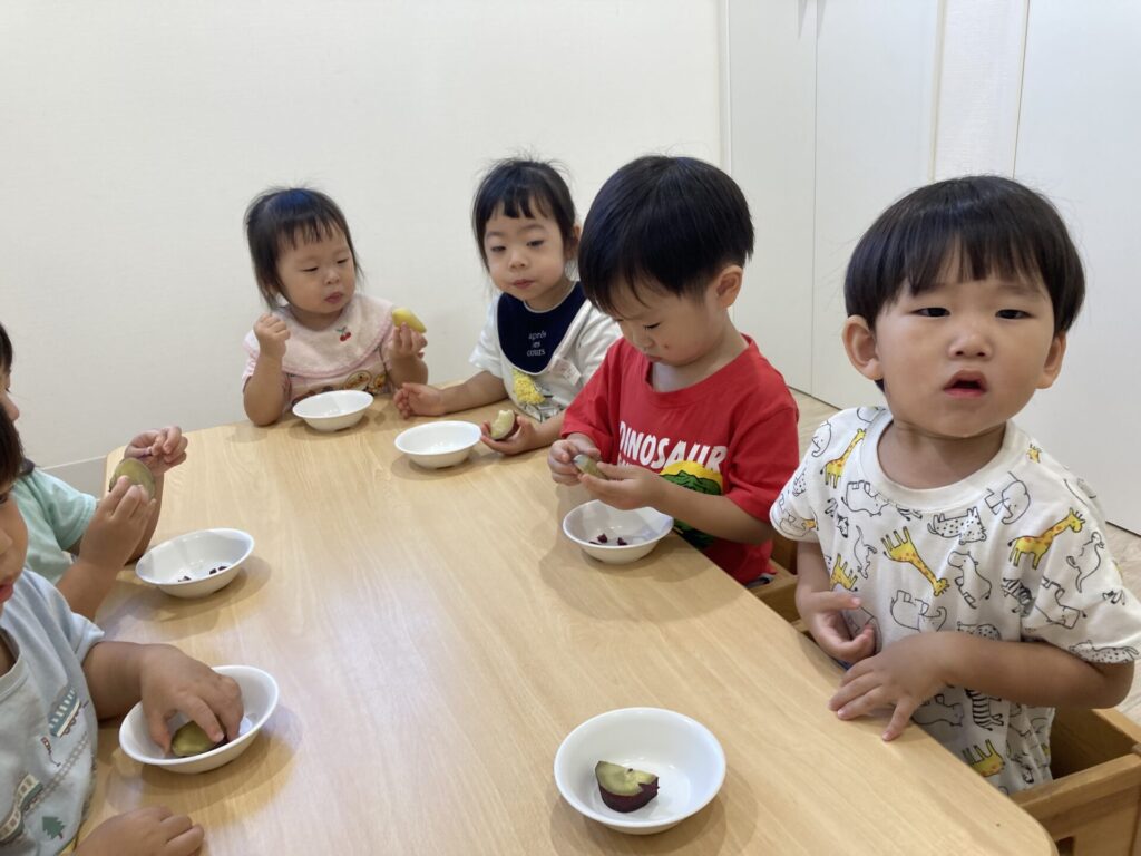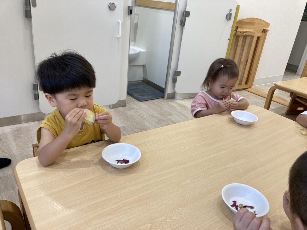 「実はね、皮も食べられるんだよ~!」と先生が皮が付いたまま食べて見せると、