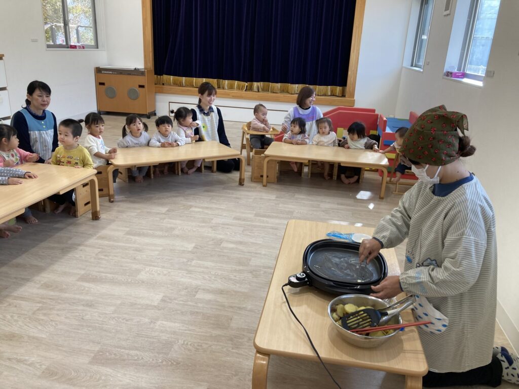 お芋を焼き始めると「パチパチ、ジュージュー」