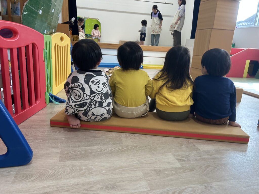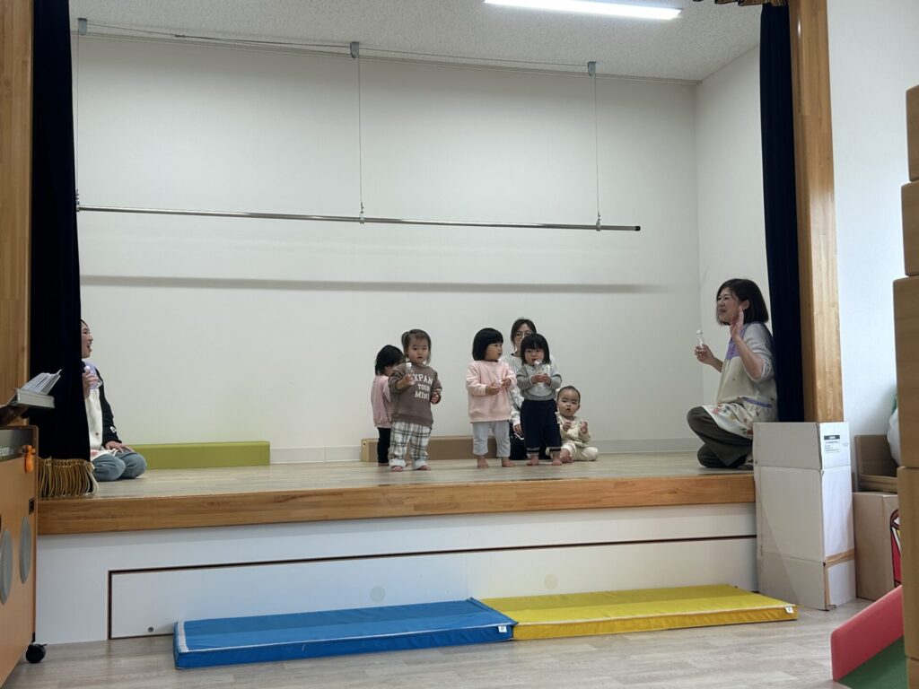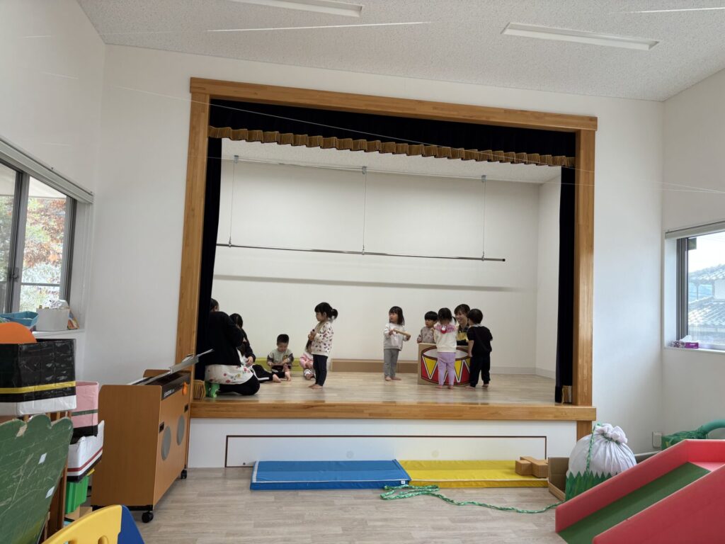 ステージでわちゃわちゃ演目を楽しむ子どもたちです。