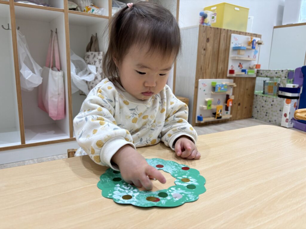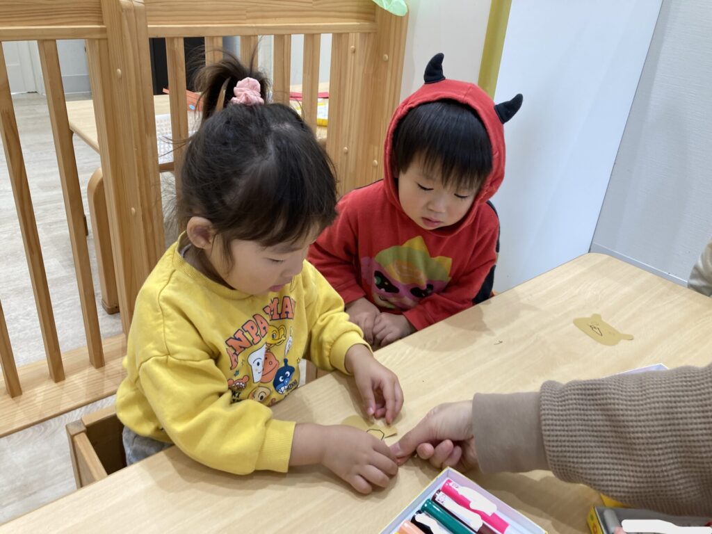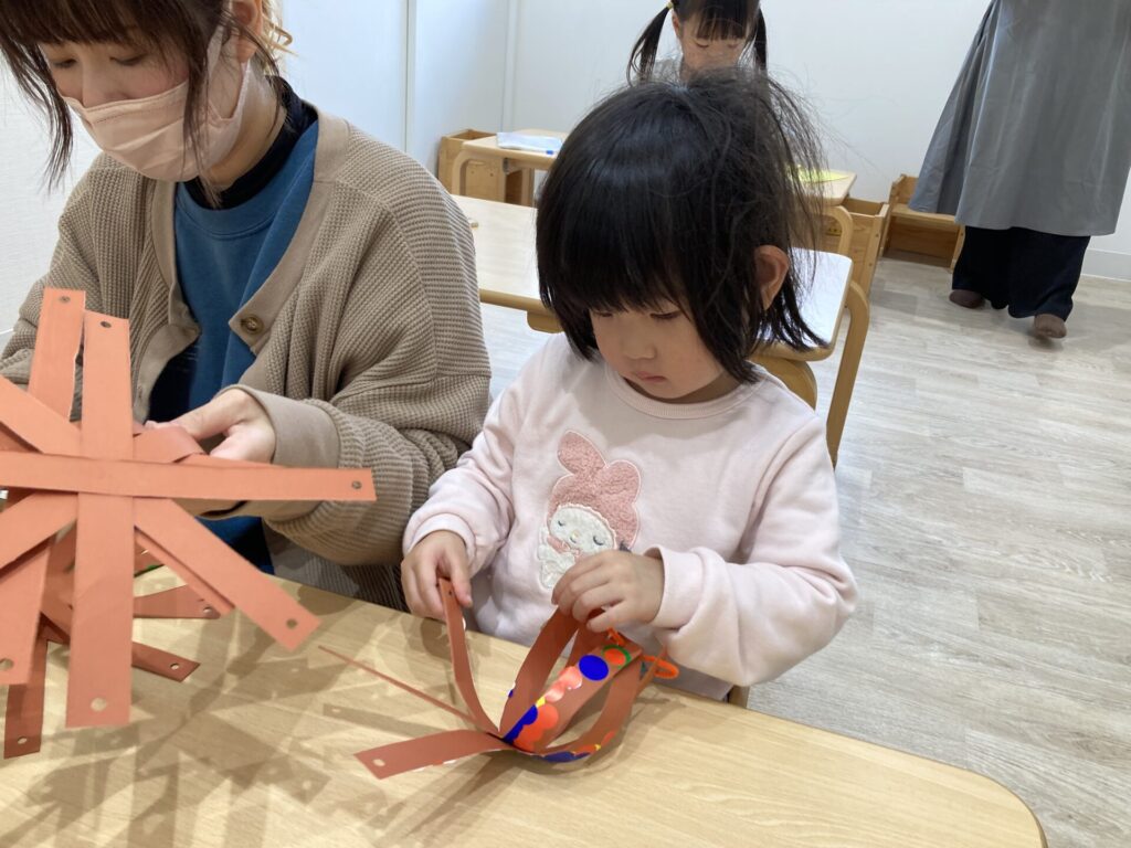 みずき組さんは顔を描いたりモールに穴をあけた画用紙を通したりと、