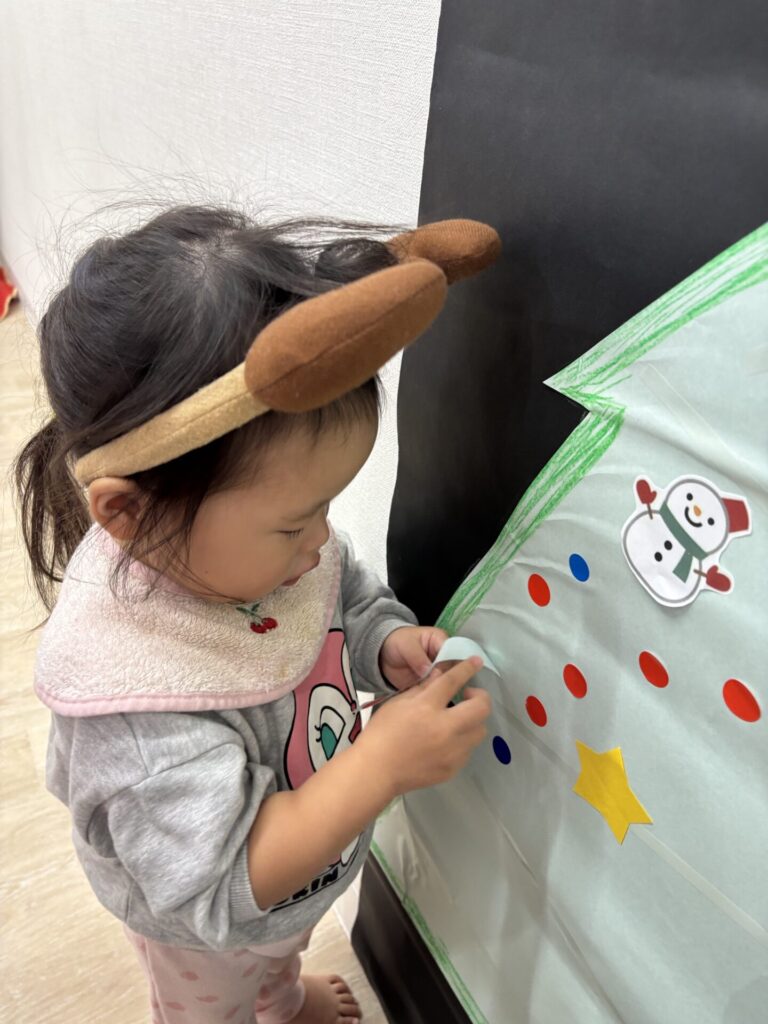 サンタさんと一緒にクリスマスツリーの飾り付けをしました。