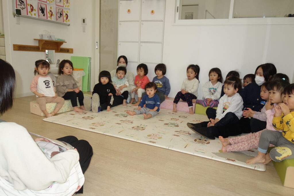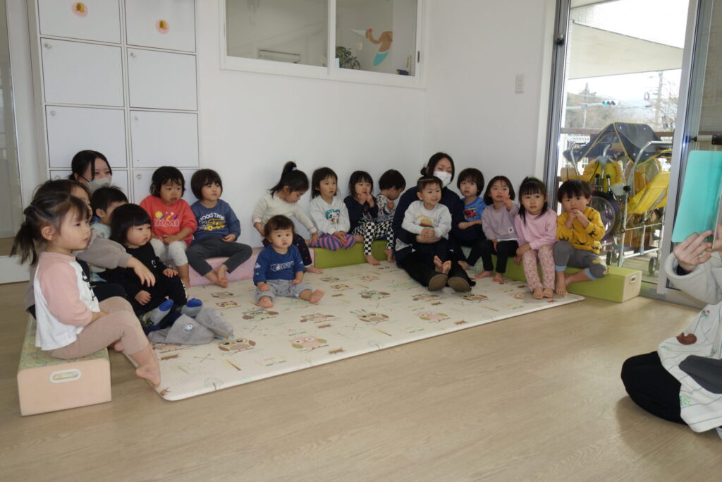 朝の会では「トイレにいきたいな!」と「まめまき」の絵本をとても集中して見ておられました。