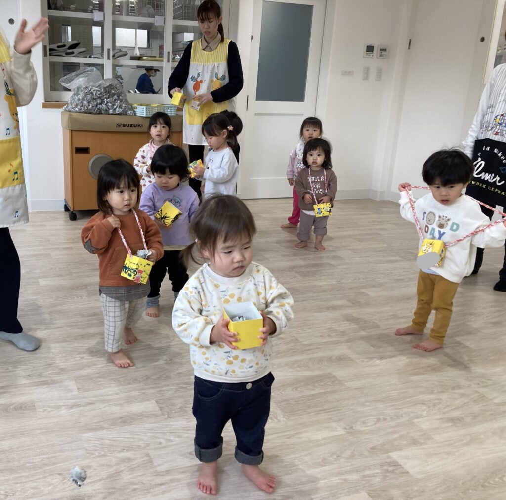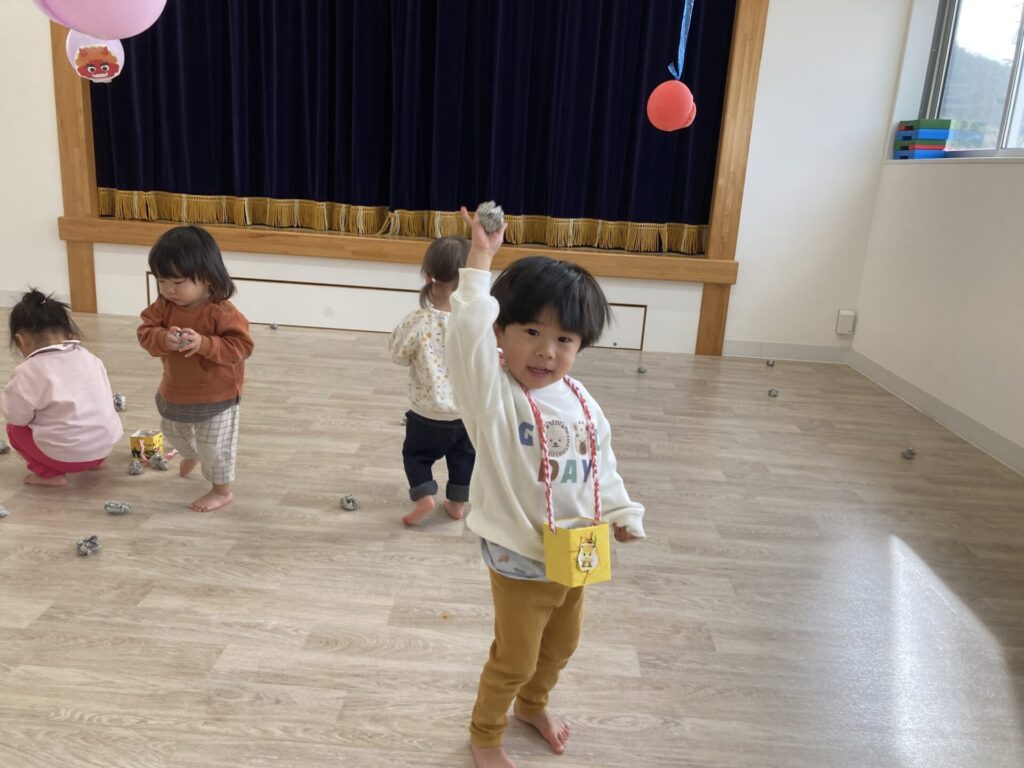 かえで組さんなつめ組さんが今日は豆まきの練習です
