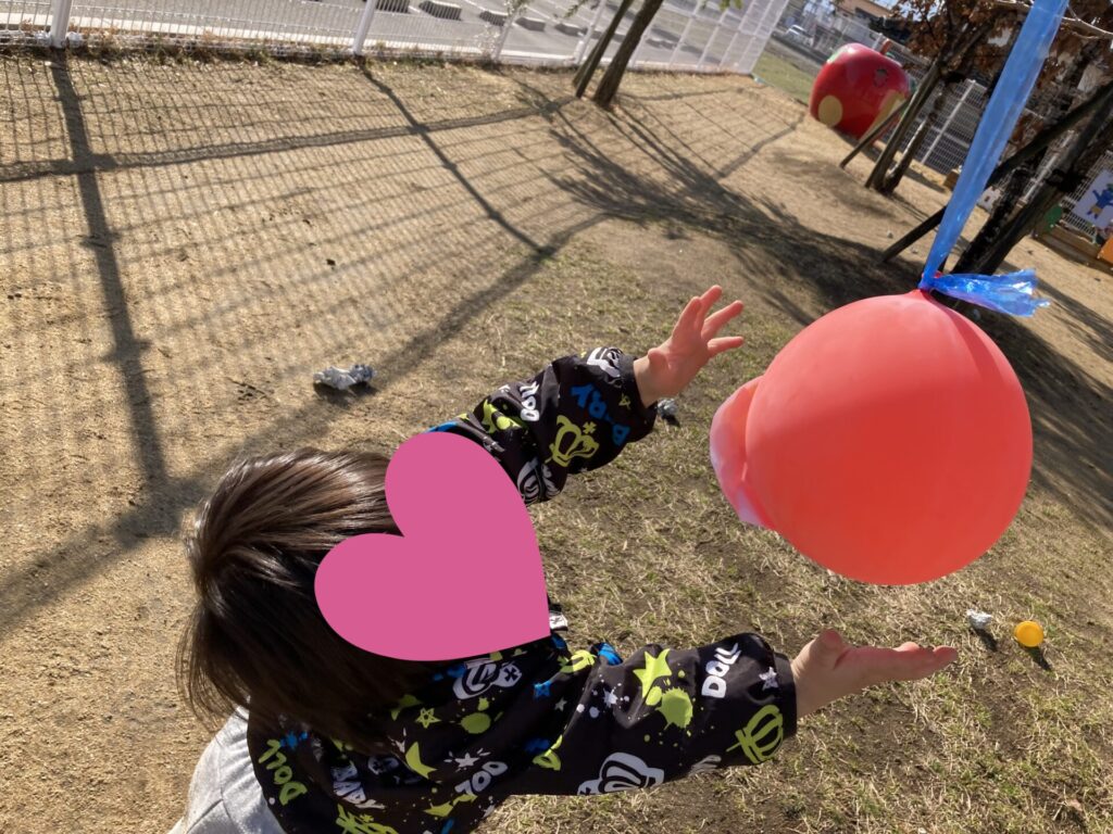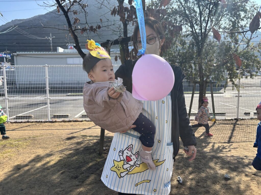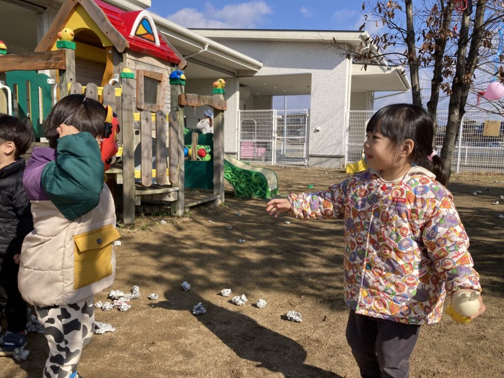 みんなで園庭に出て風船鬼さんに豆まきをしました。