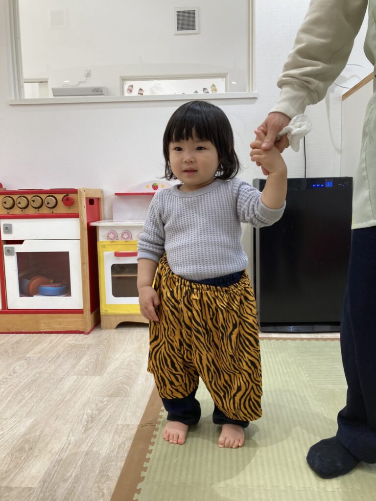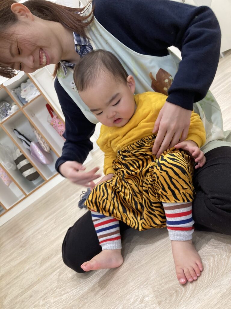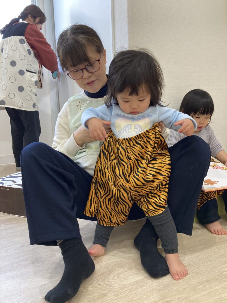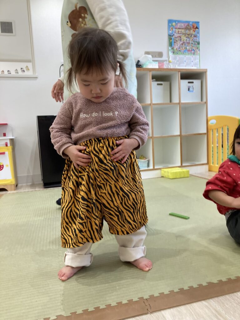 「○○ちゃんもする!」と近付いてきて、ズボンを手に取ったりはいたりしていました。