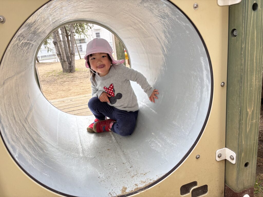 滑り台に隠れて楽しそうですね。