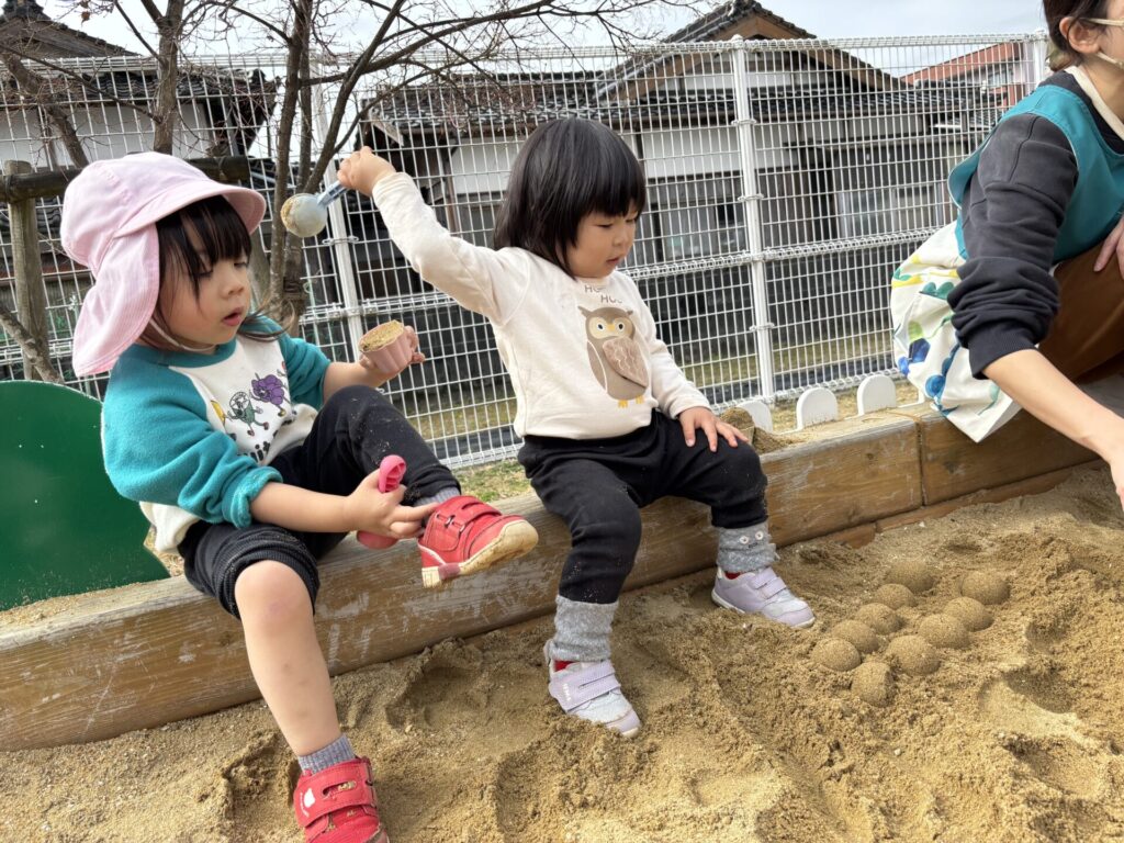 今日の砂場ではアイスクリームやごちそう、大きなお山など色々な物が出来ました😊