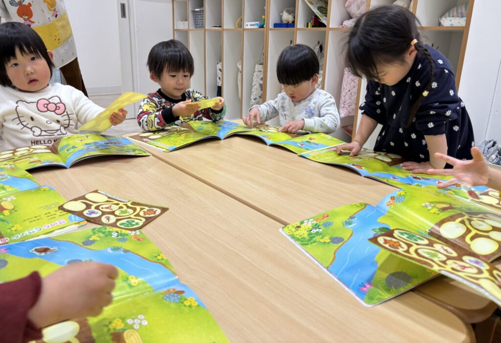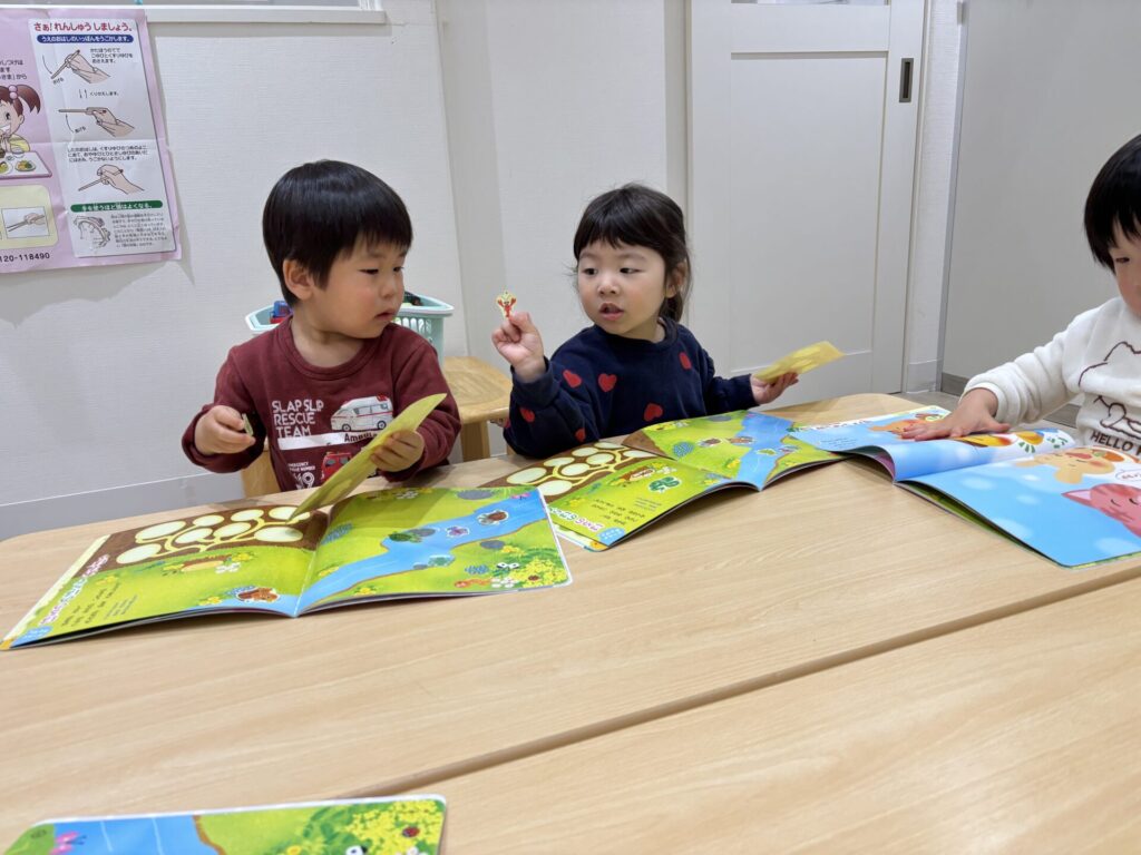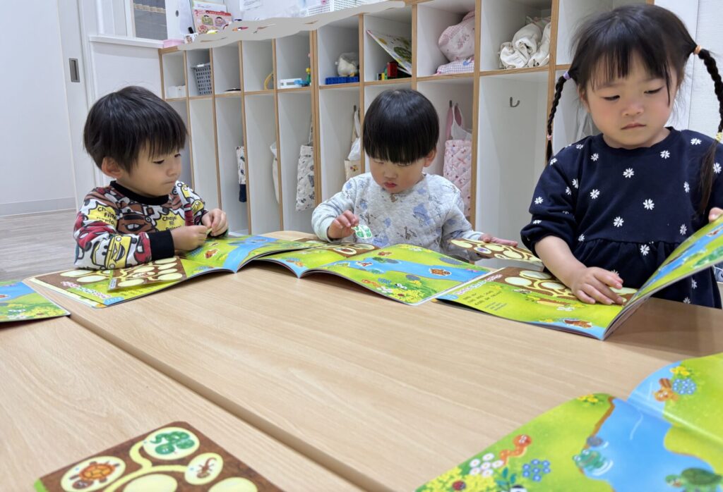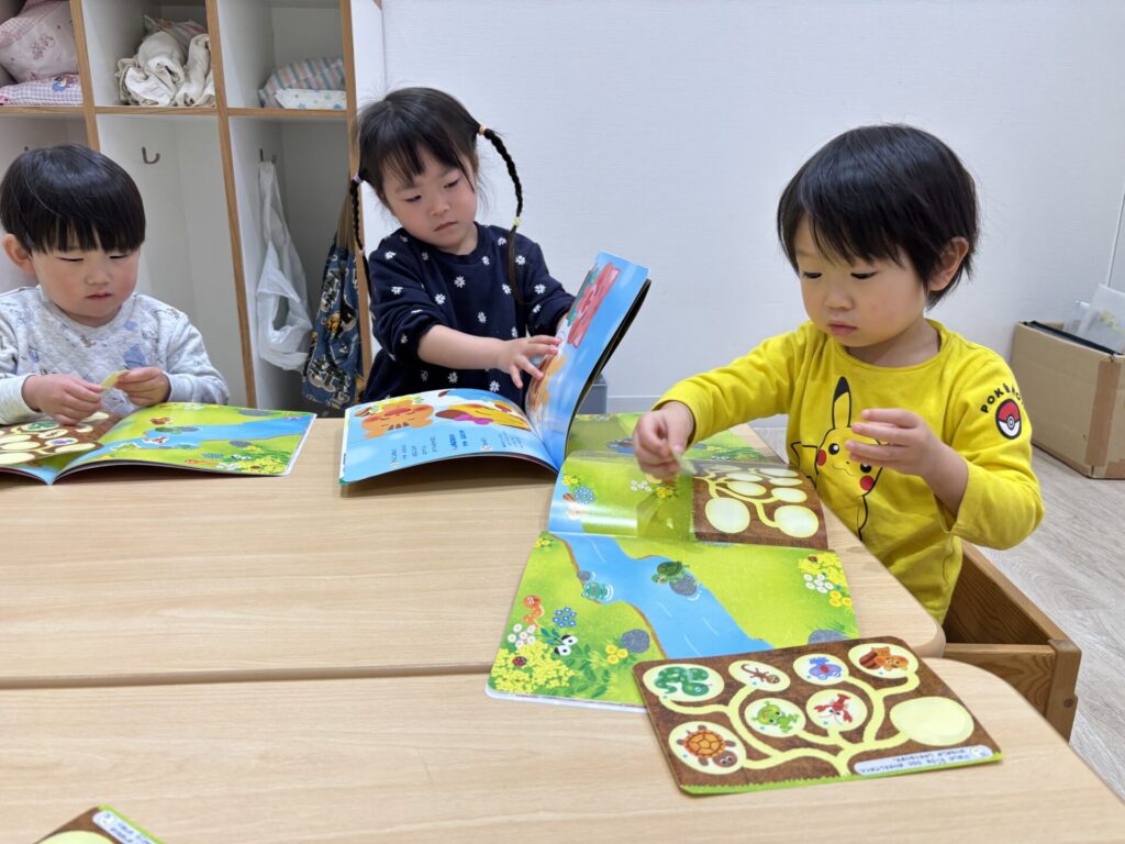みずき組さんは月間絵本のシール貼りをしました。