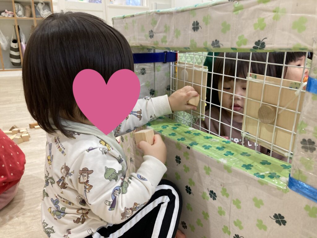 この網積み木がにすっぽり入る事に気づきました!向こう側のお友達に渡せます😄