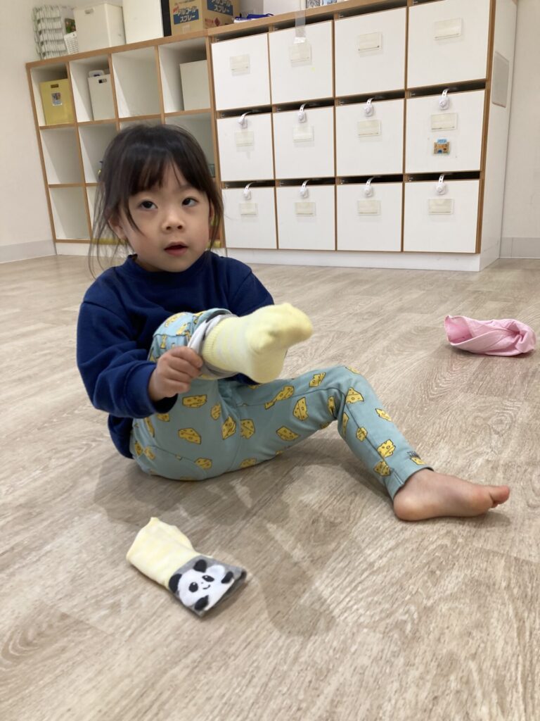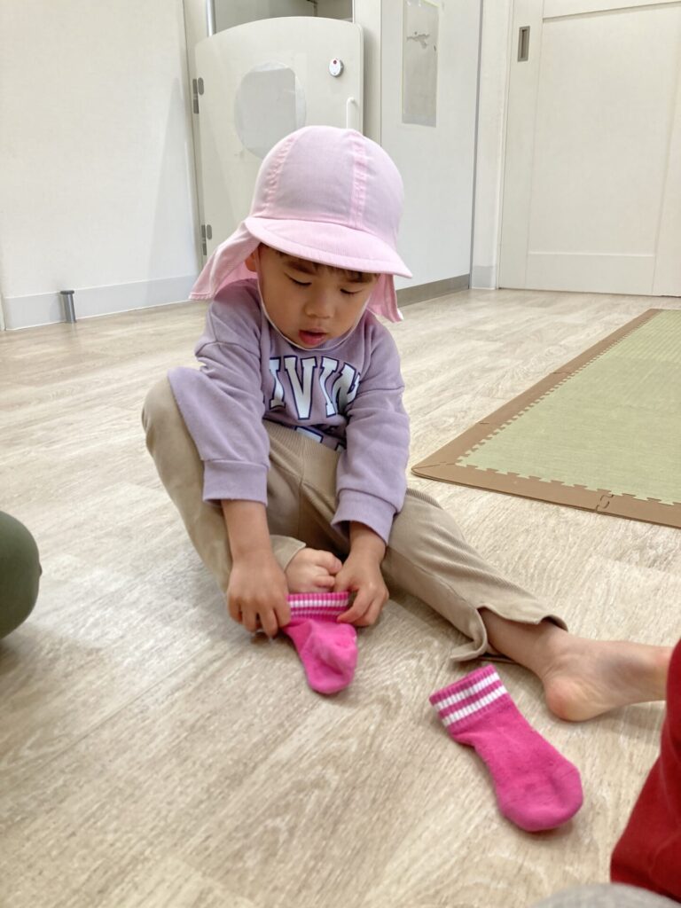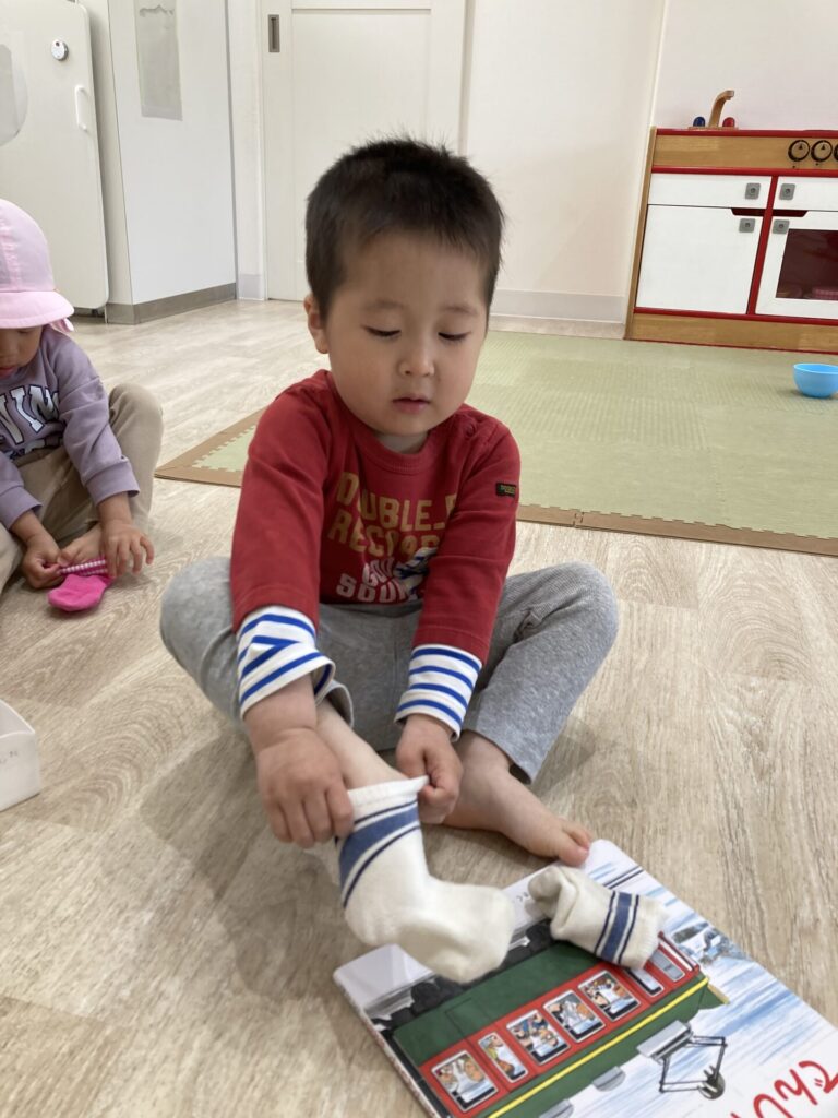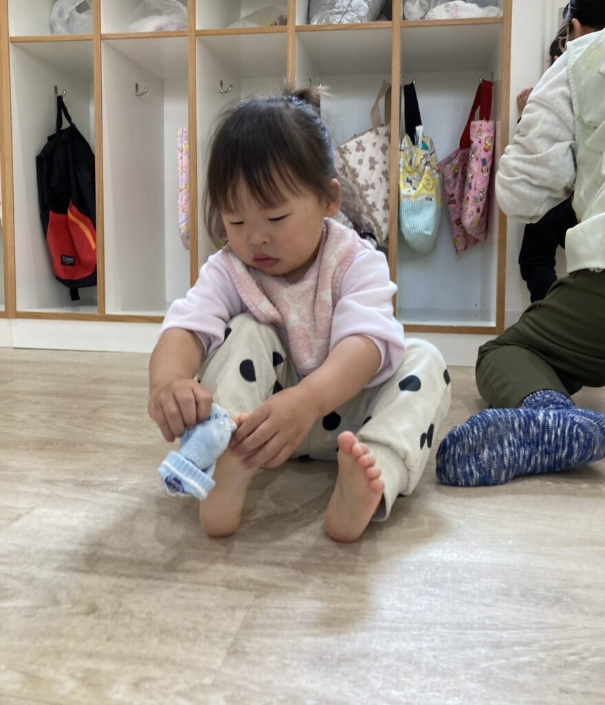 外に出ようか、と声をかけると、自分で靴下や靴を履こうと頑張る姿が多く見られるようになってきまたかえで組さんです。「自分でできる」ことが嬉しいですね😄