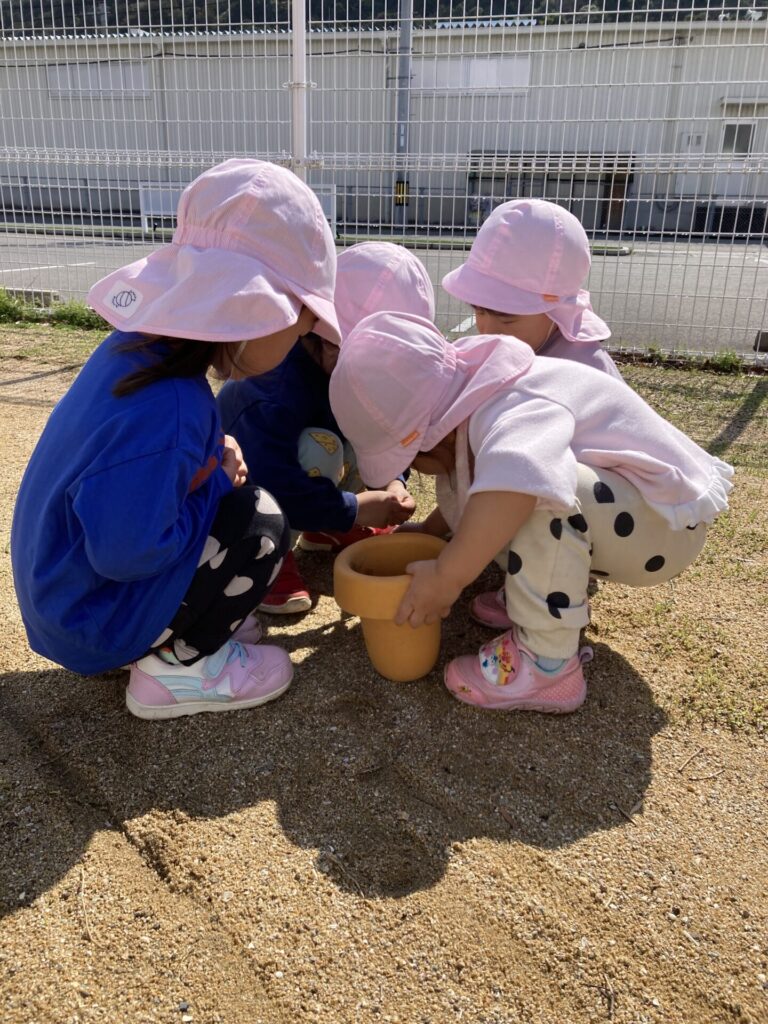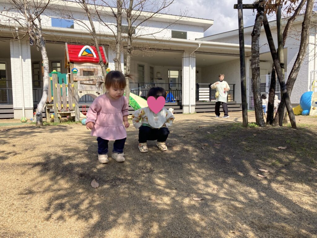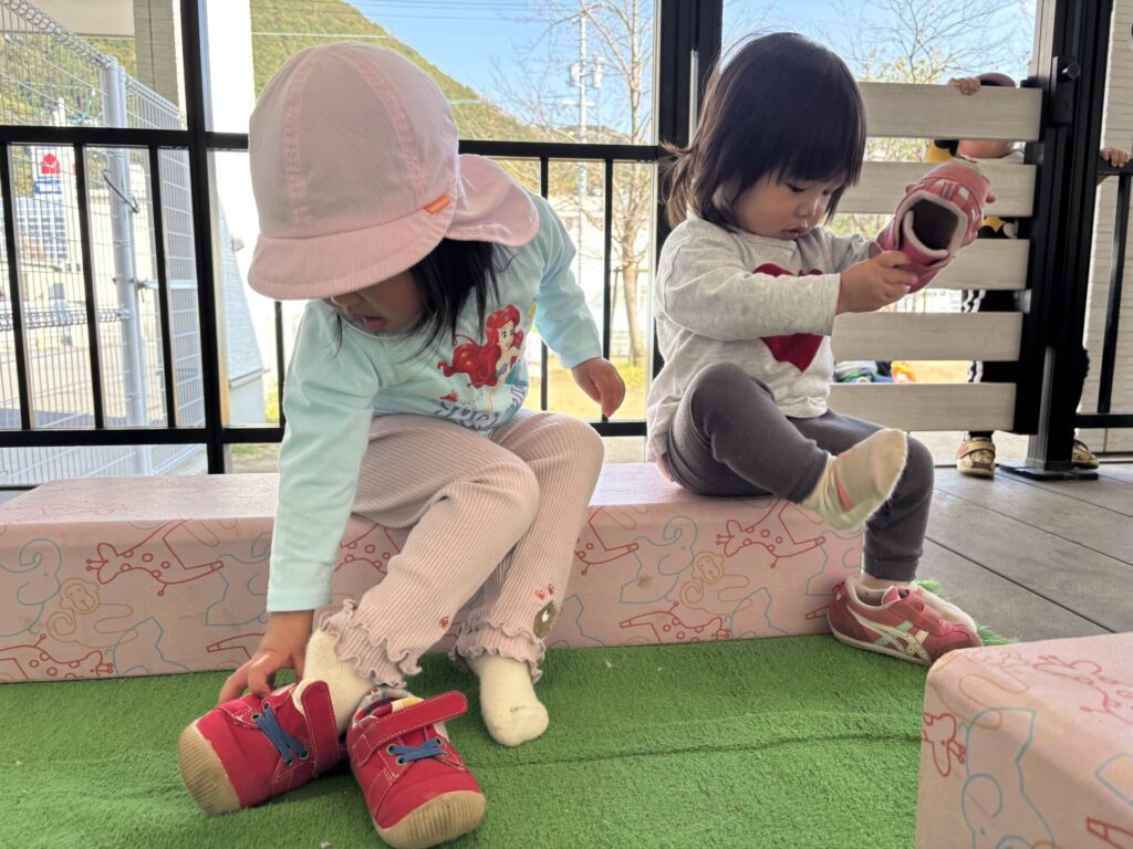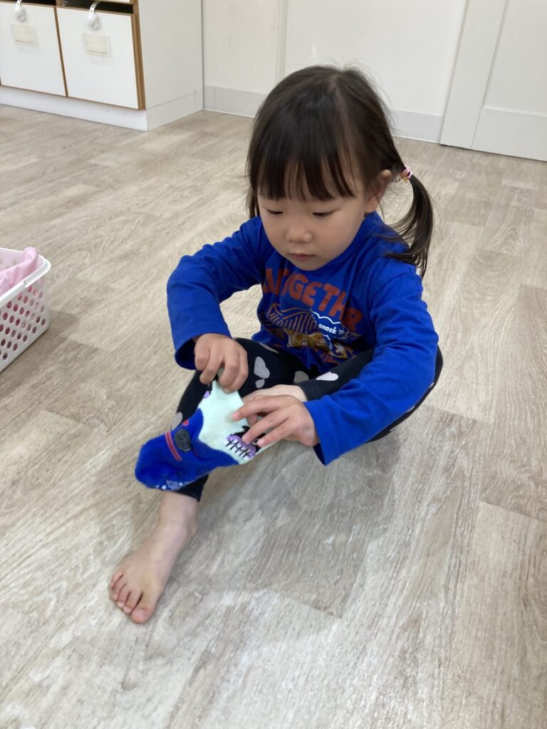 外に出ようか、と声をかけると、自分で靴下や靴を履こうと頑張る姿が多く見られるようになってきまたかえで組さんです。「自分でできる」ことが嬉しいですね😄