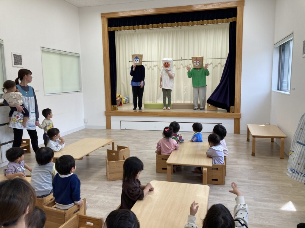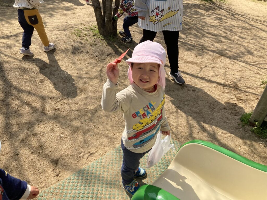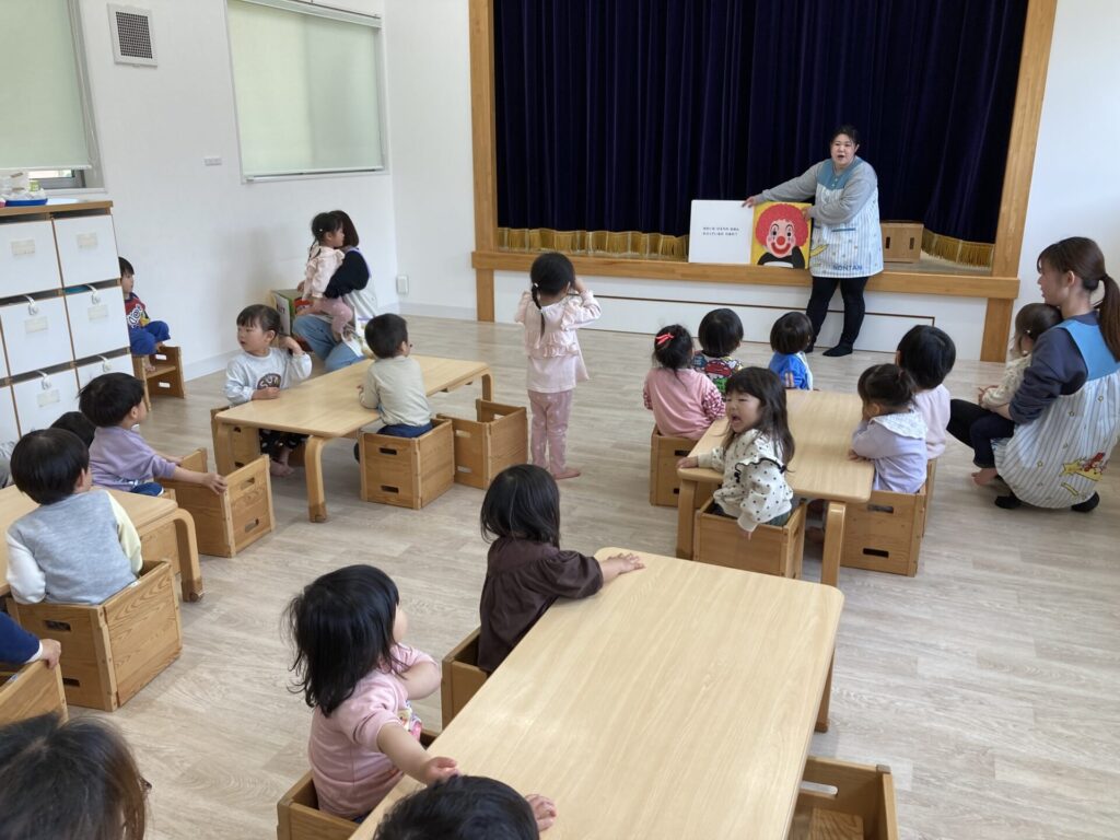 元気いっぱい、小さいクラスのお友達に向かって