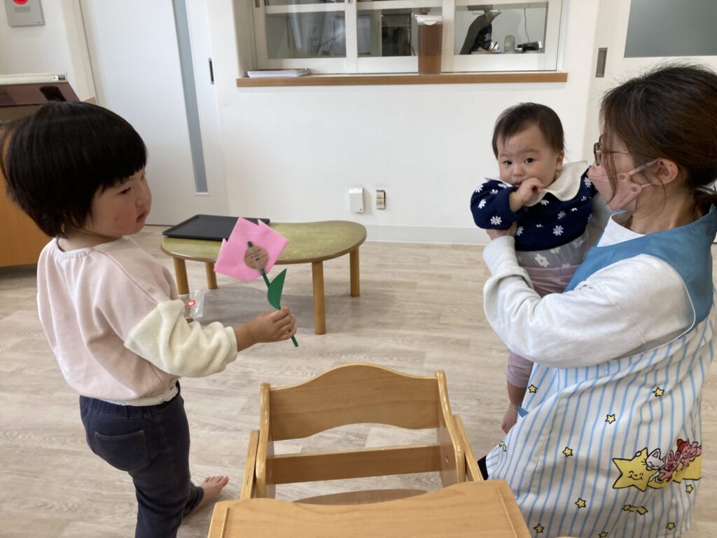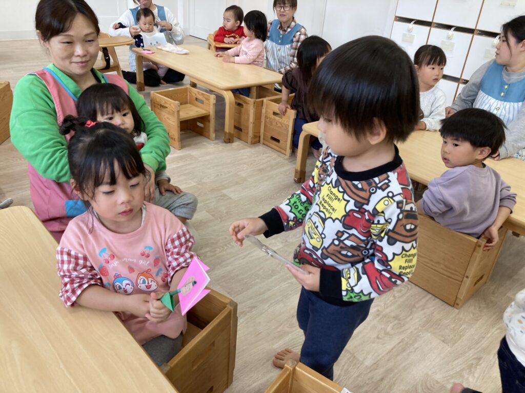 小さいお友達から、みずき組さんへプレゼントを渡し・・・