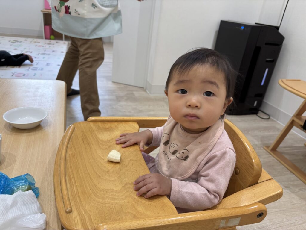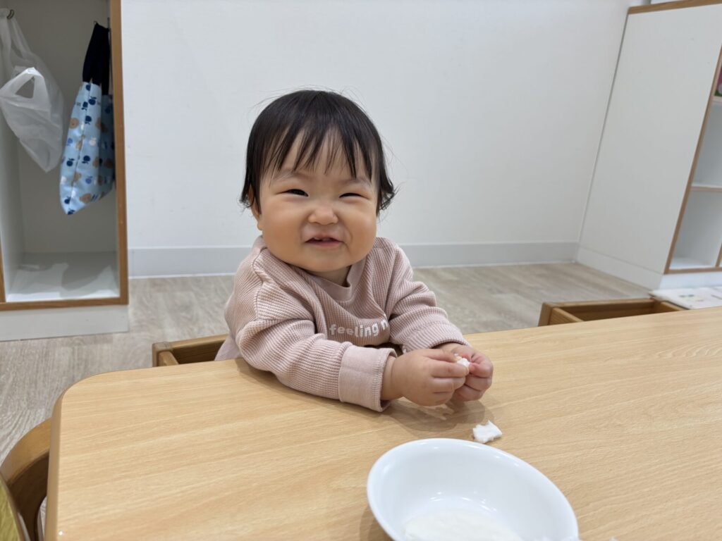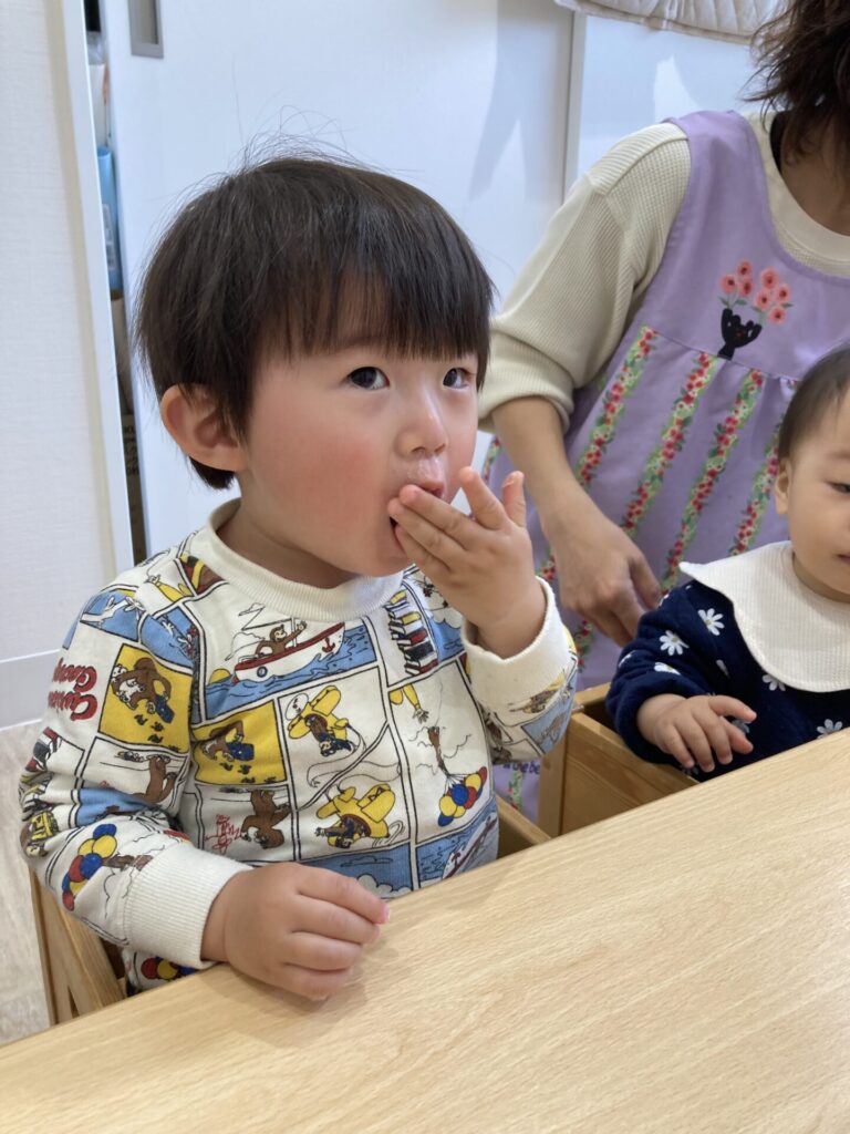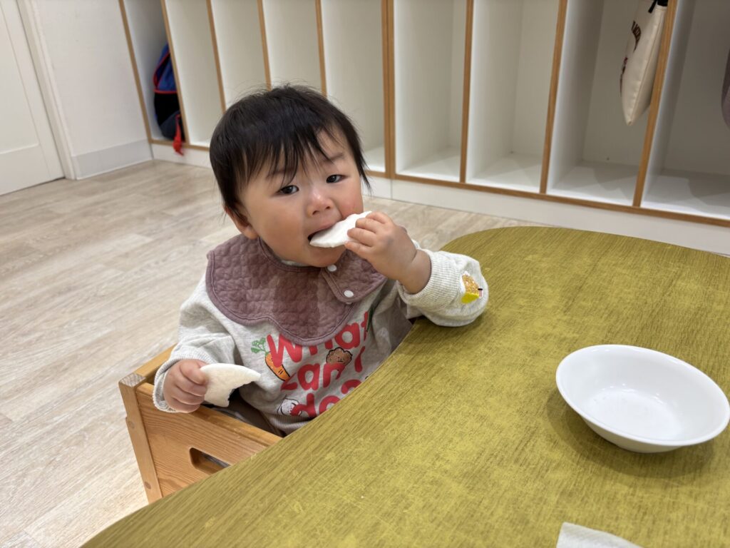 回りのお友達の様子をを見たり、おやつを食べたりしています。