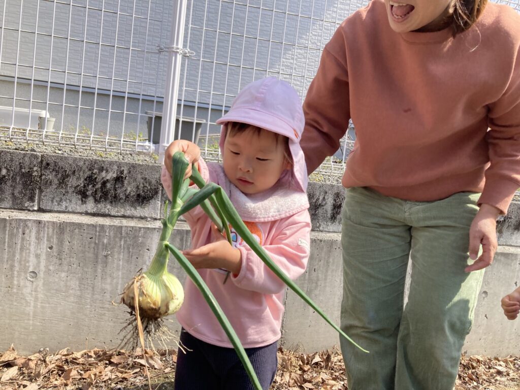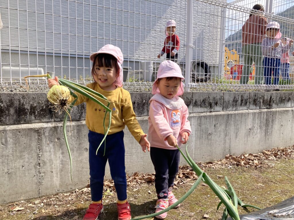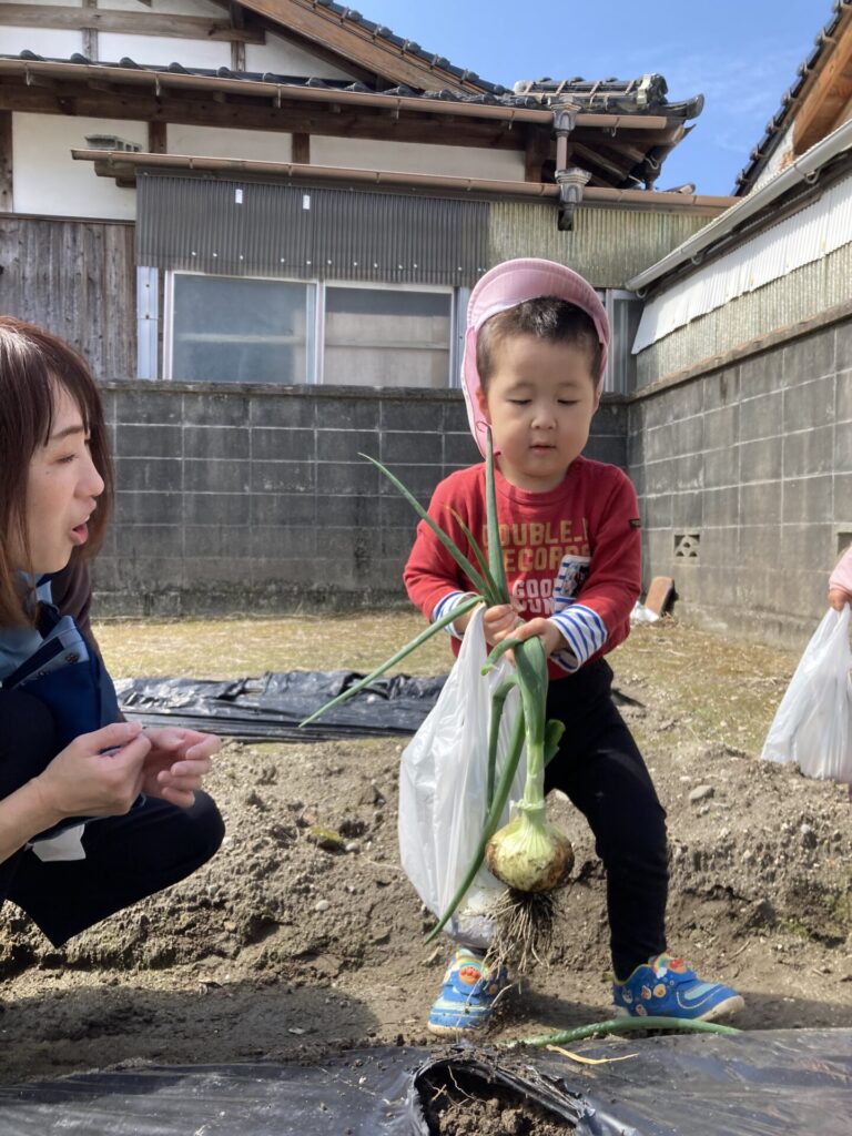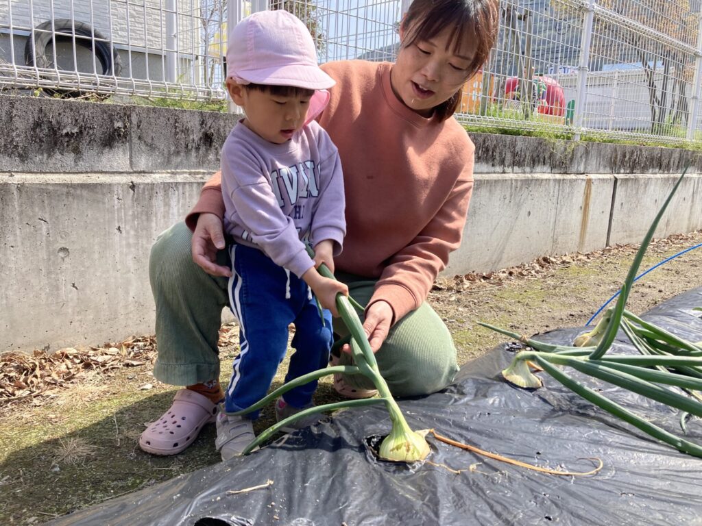 みずき組さんは隣のおじいちゃんの畑に玉ねぎの収穫に行きました。