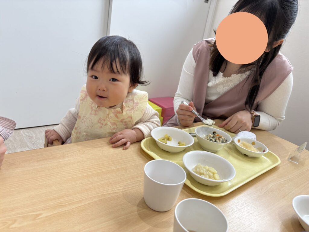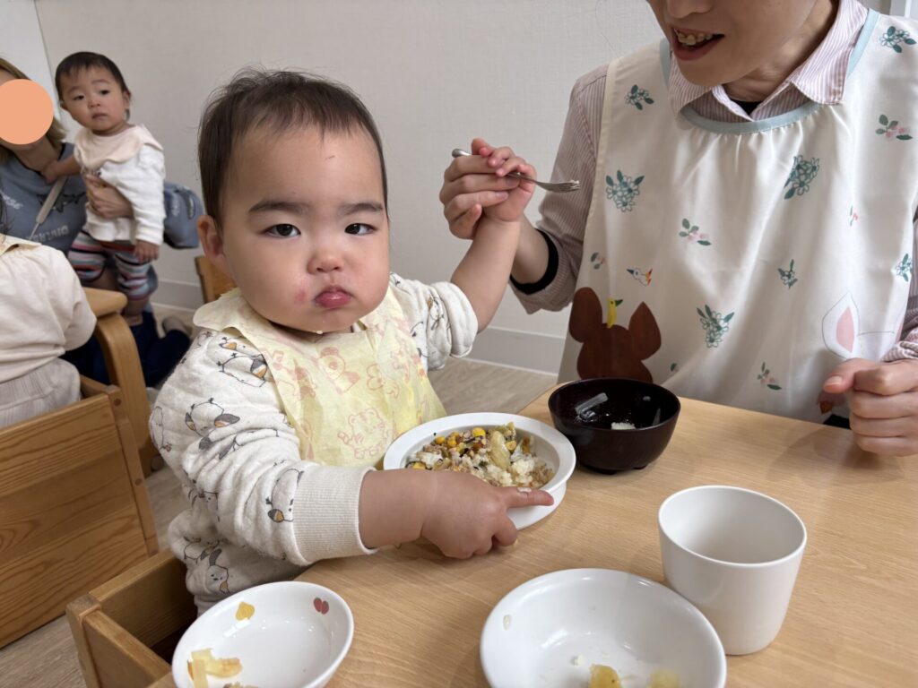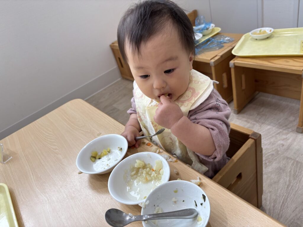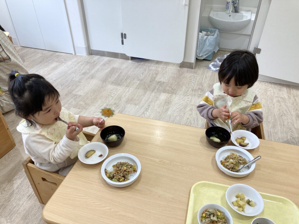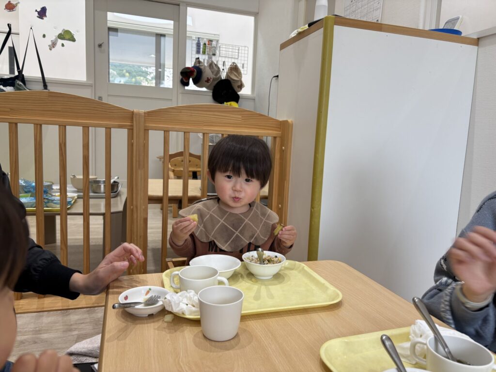 今日は新入園児さんが始めてお給食を食べました。