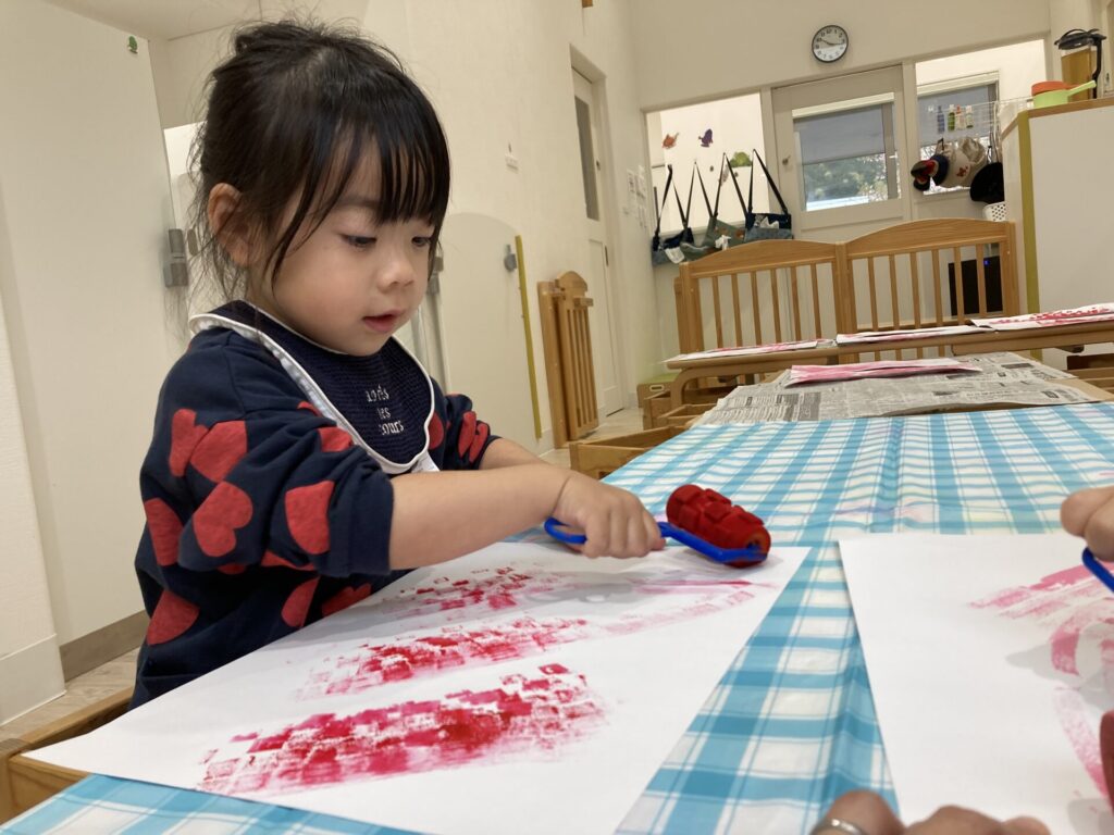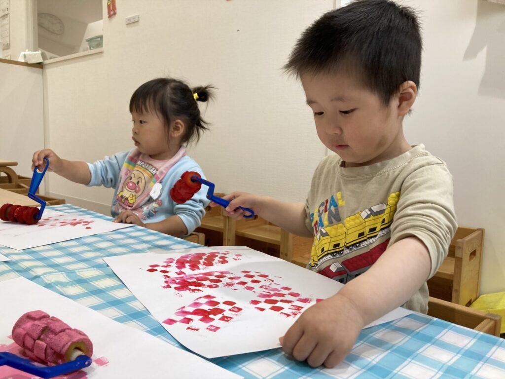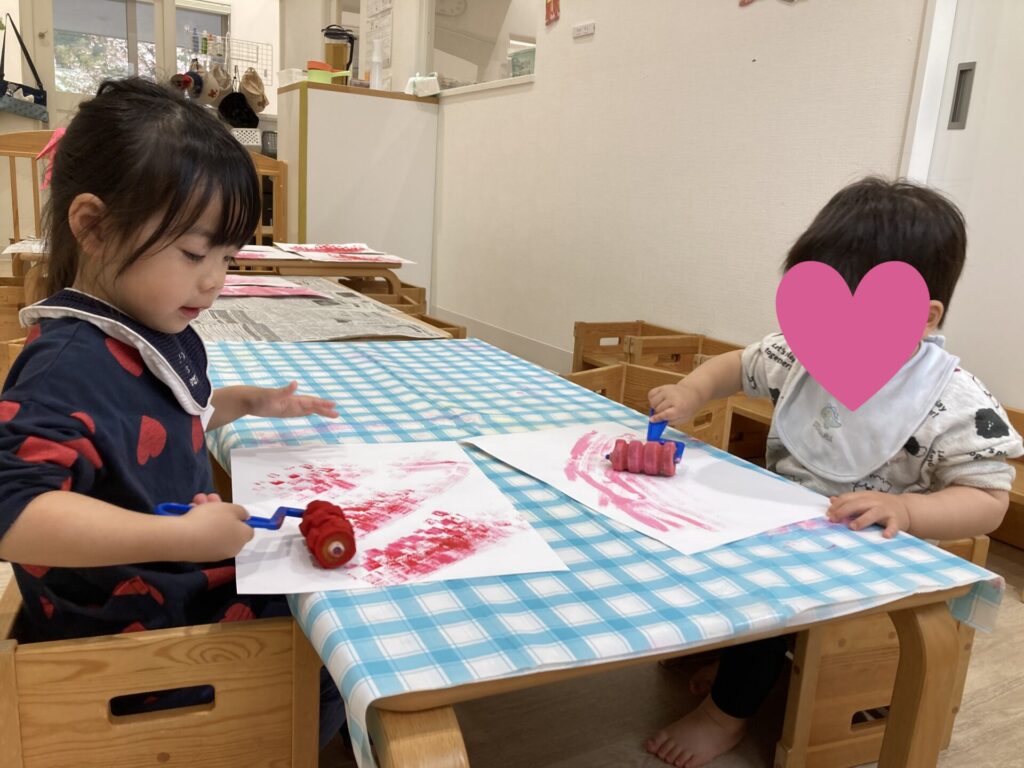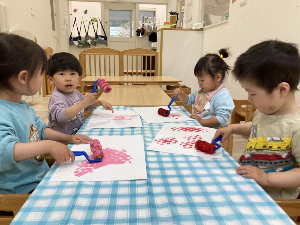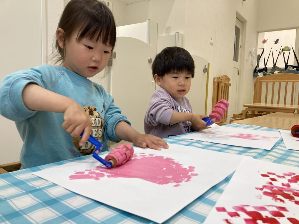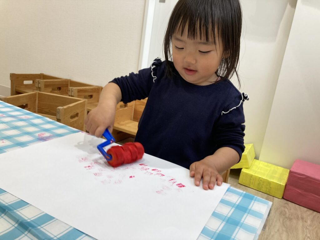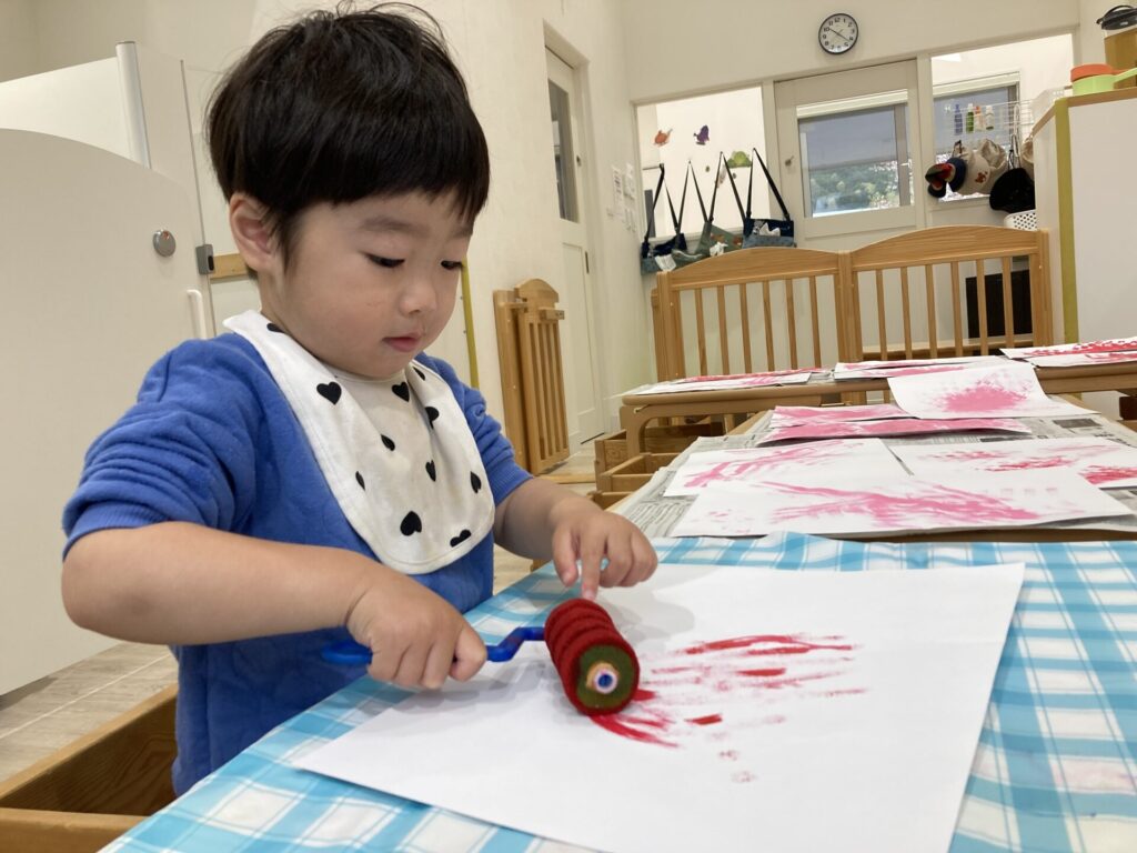 「もっとする~」と沢山たくさんコロコロ絵の具をつけていきました😄