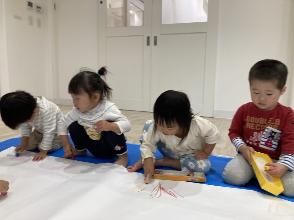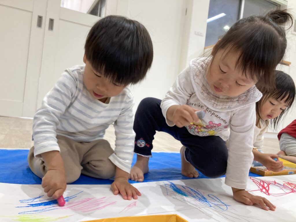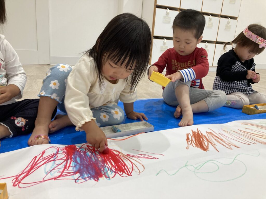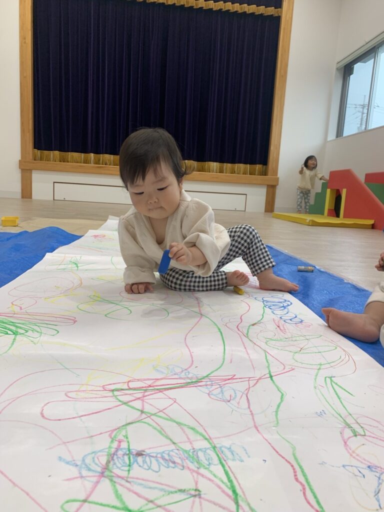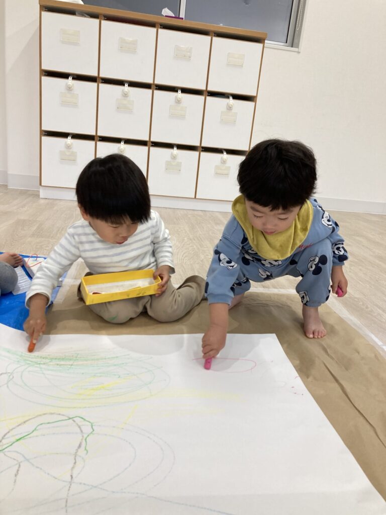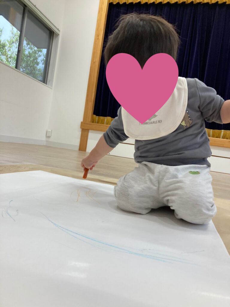 昨日の絵の具とはまた違った、クレヨンでの線遊びを楽しめました😆