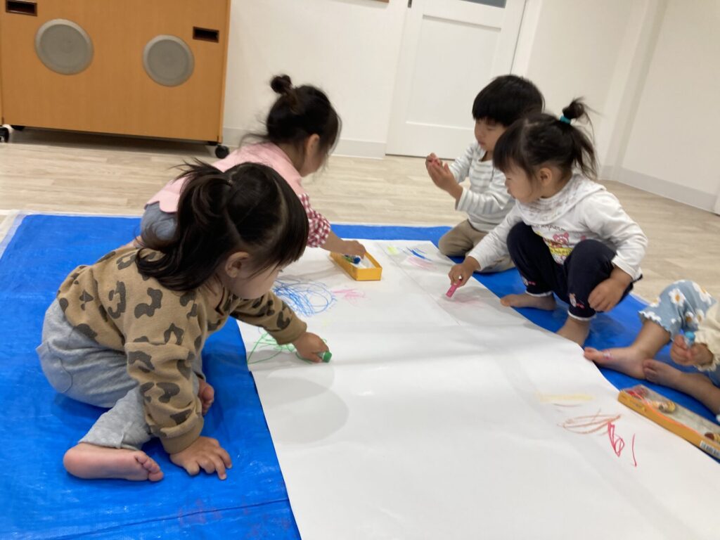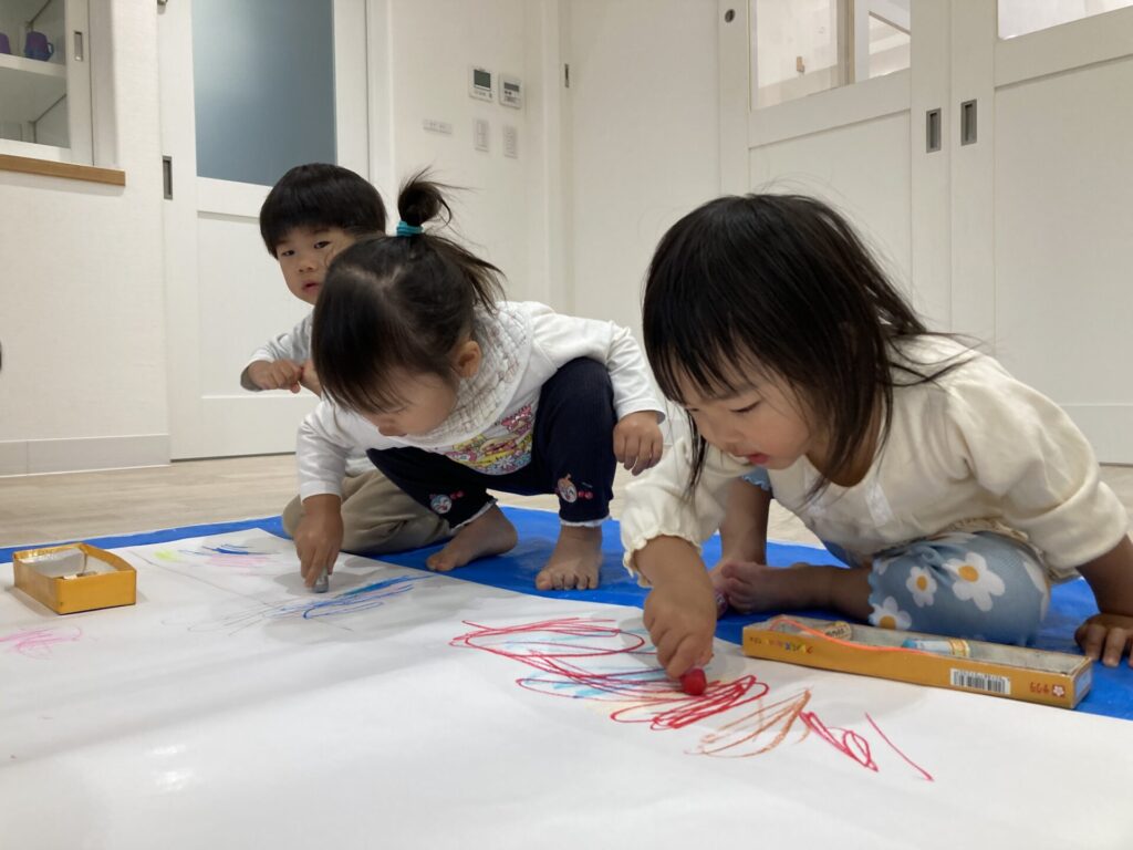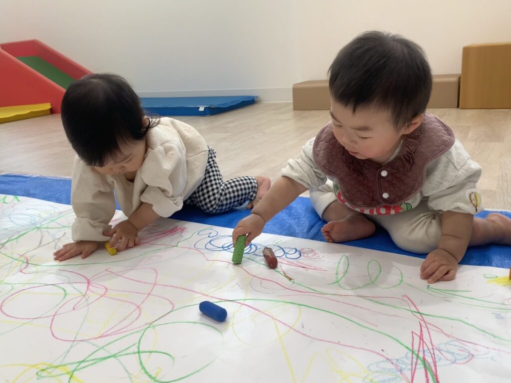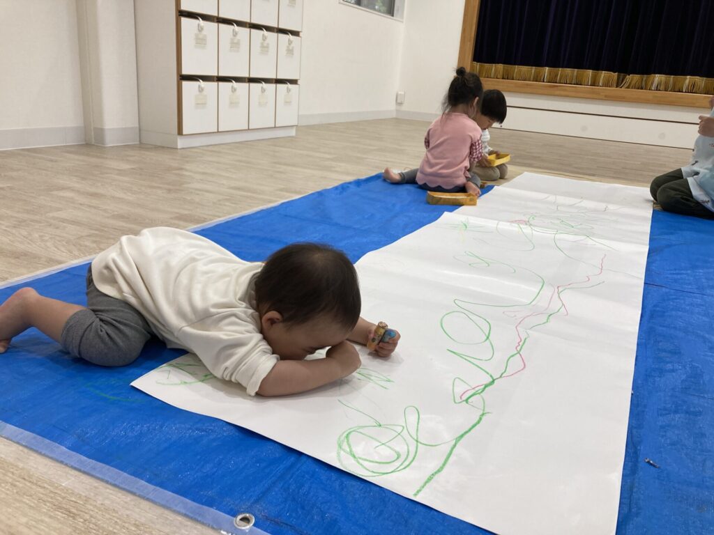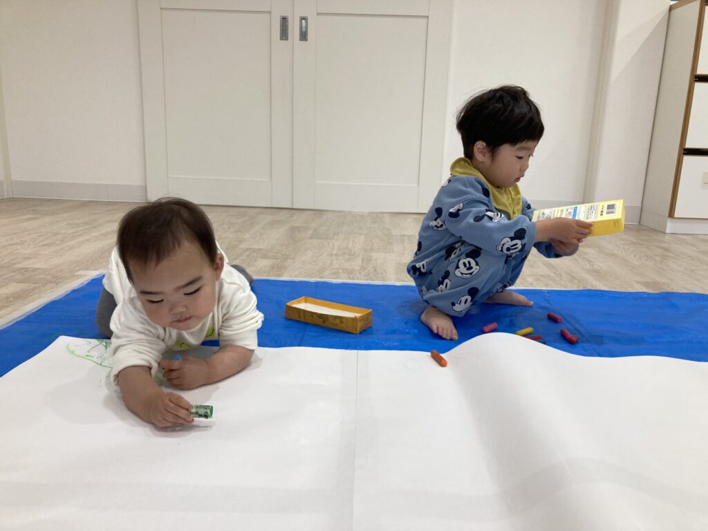 昨日の絵の具とはまた違った、クレヨンでの線遊びを楽しめました😆