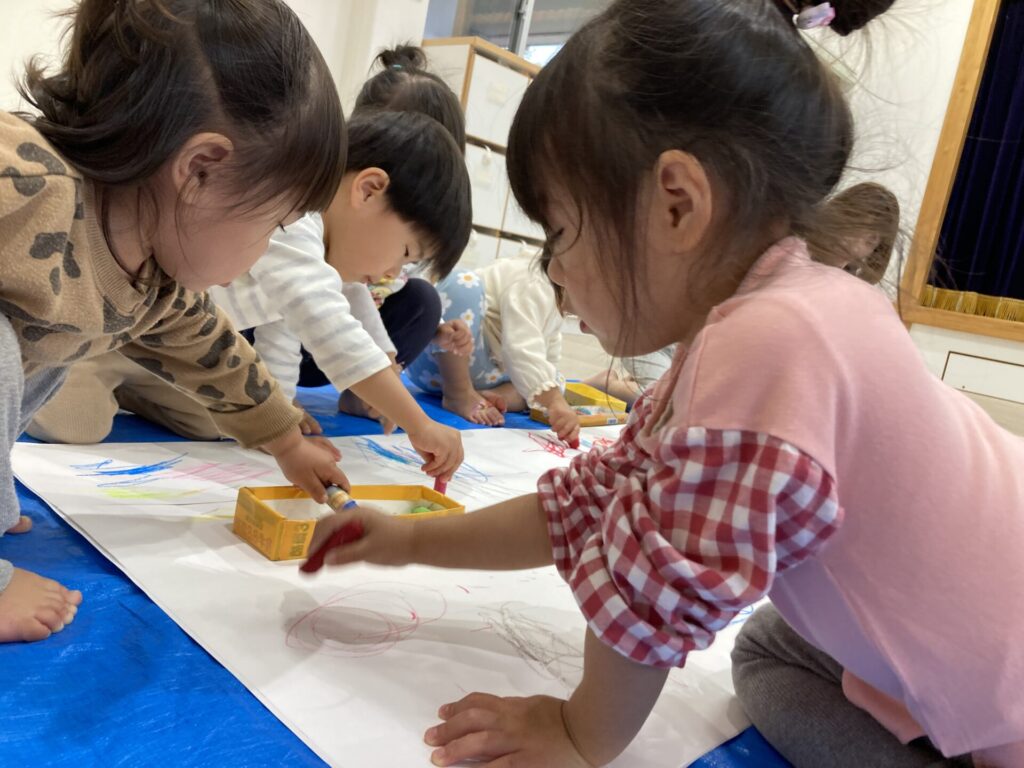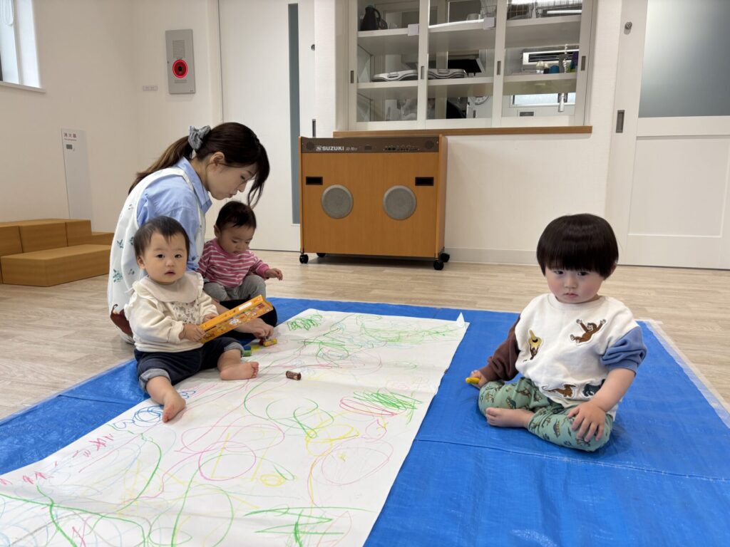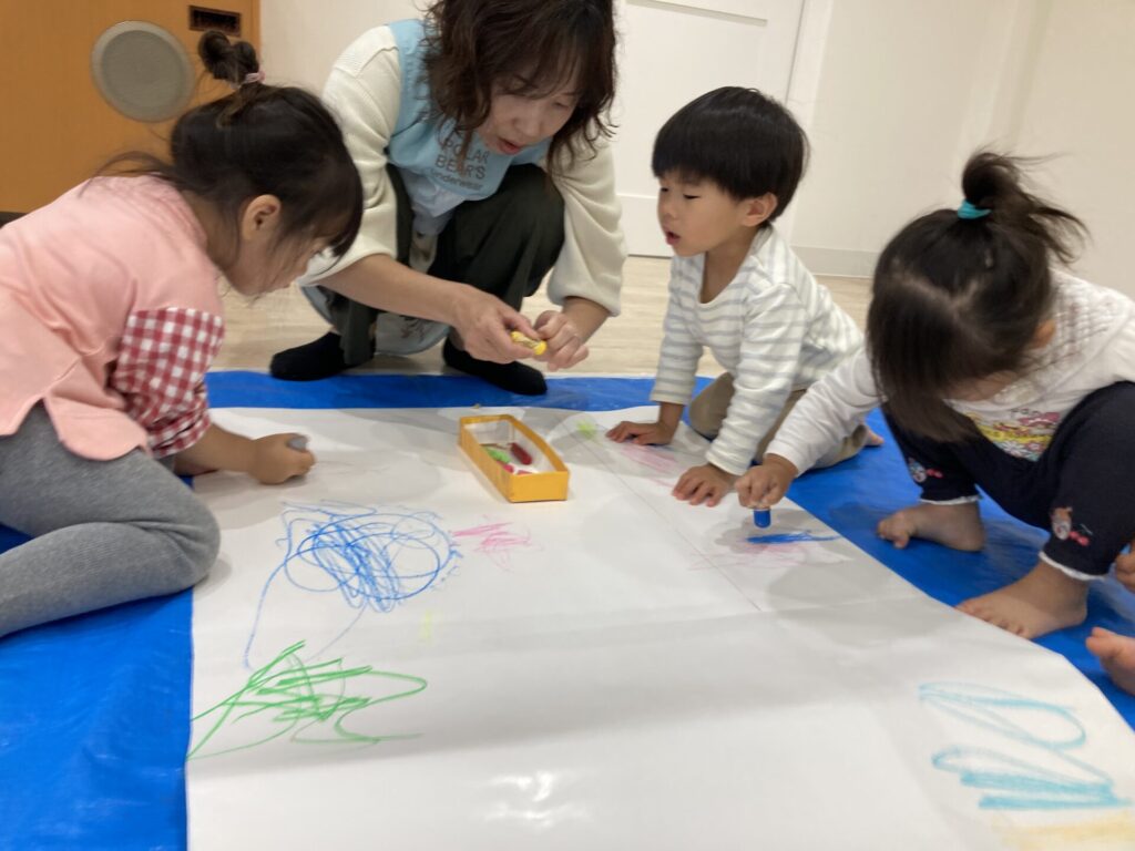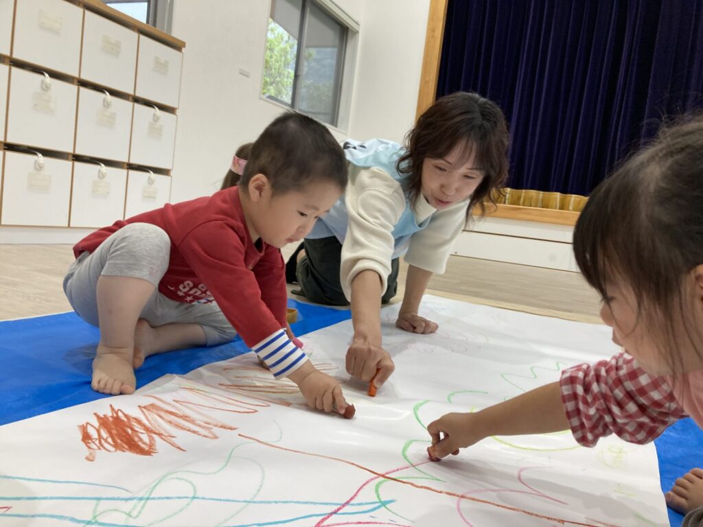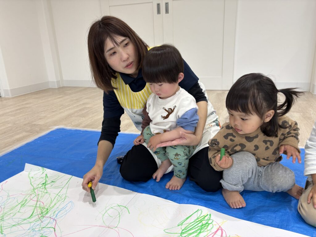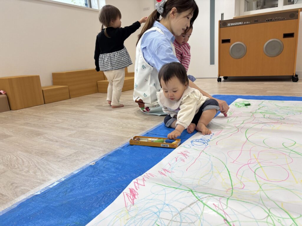 昨日の絵の具とはまた違った、クレヨンでの線遊びを楽しめました😆