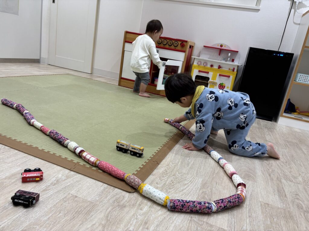 電車のおもちゃだけでは足らず、布のおもちゃも長く長く繋げてます(笑)