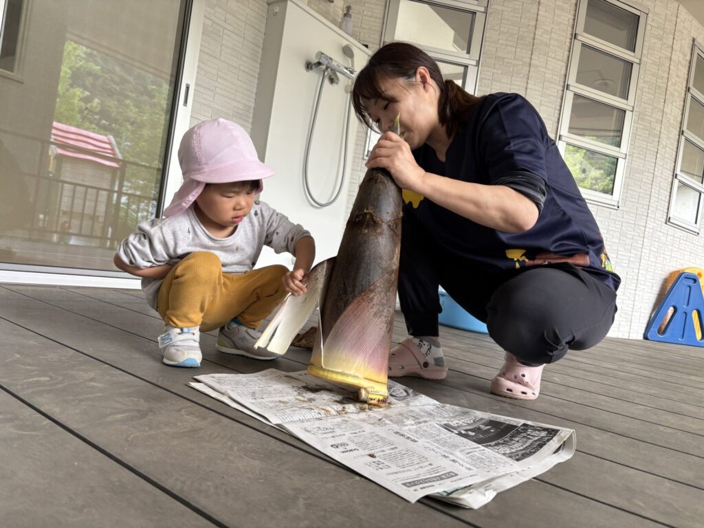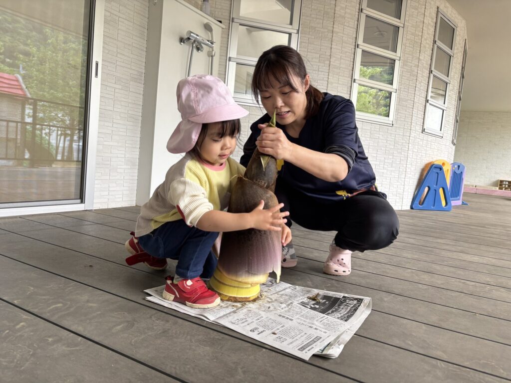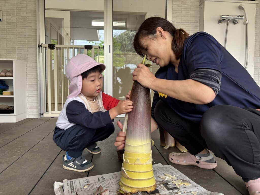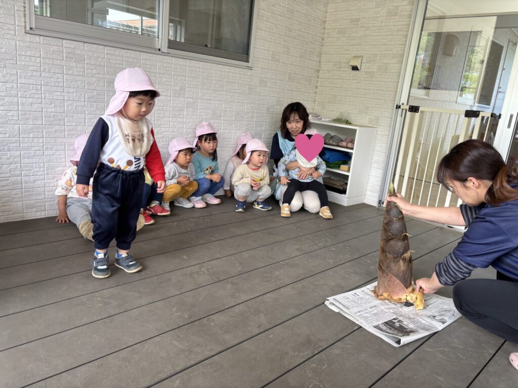 みんな、興味津々で「たけのこさんのおようふく、ぬがせてあげる」