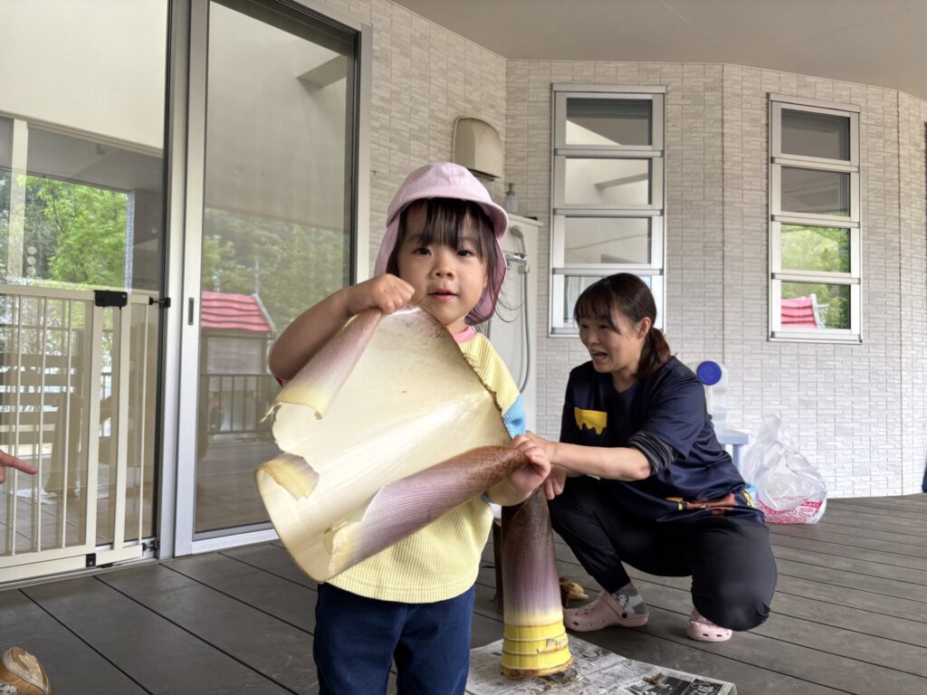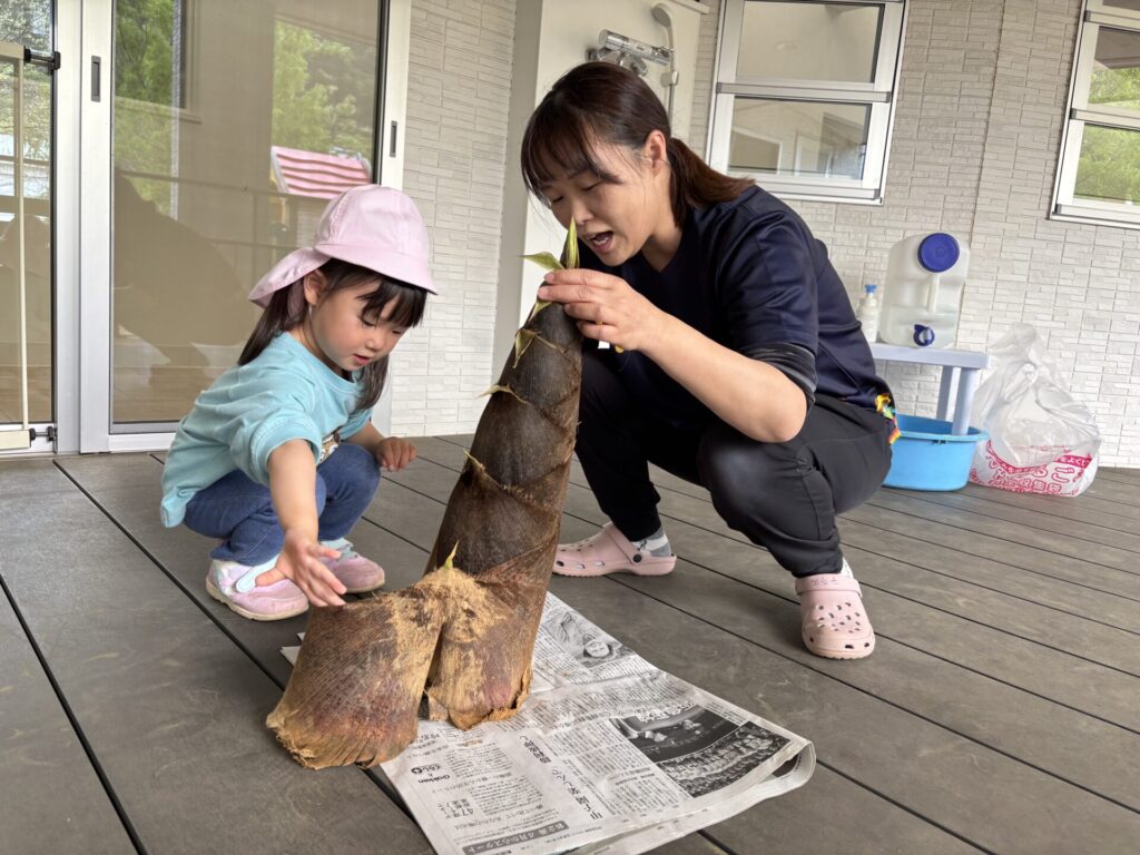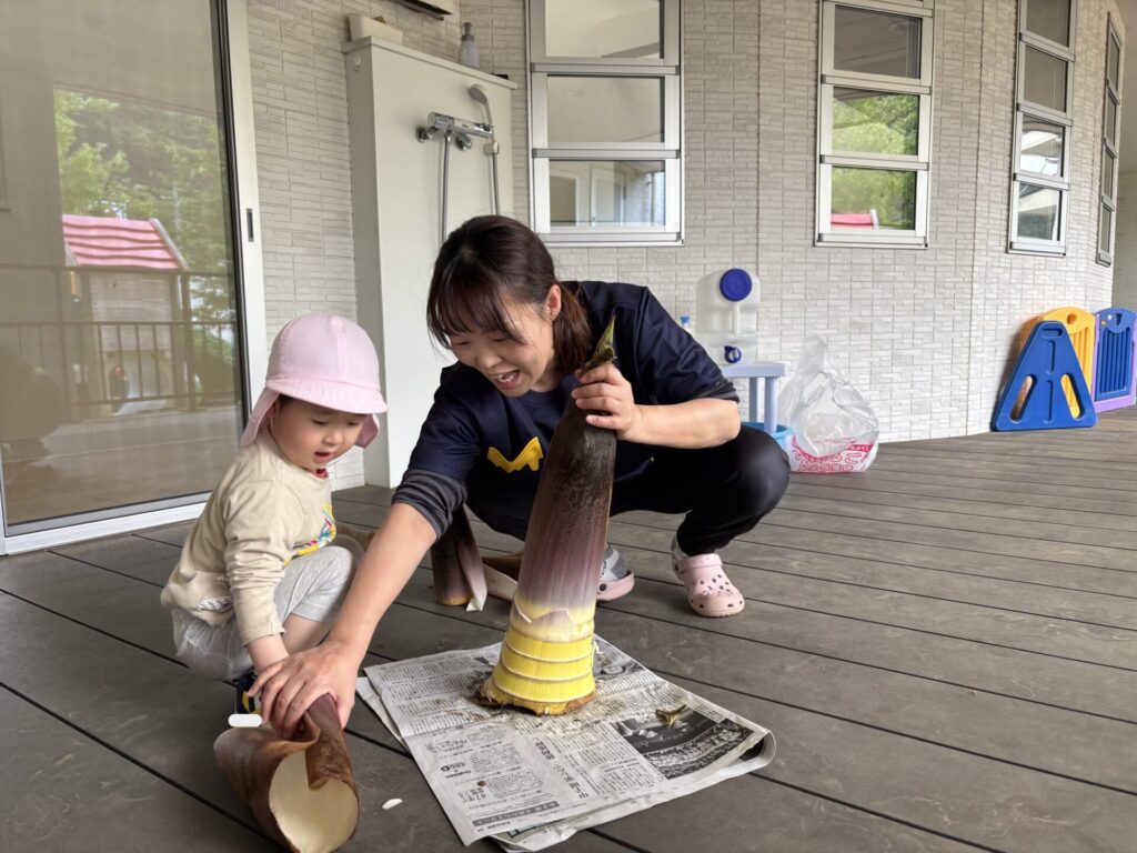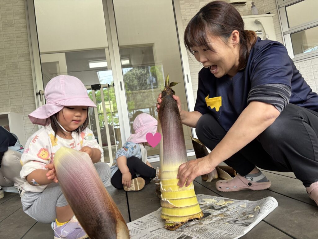 いざたけのこに近付くとちょっぴり腰が引けてしまう子どもたち(笑)